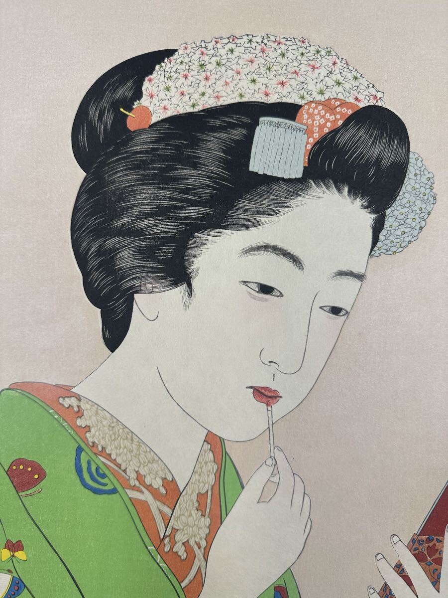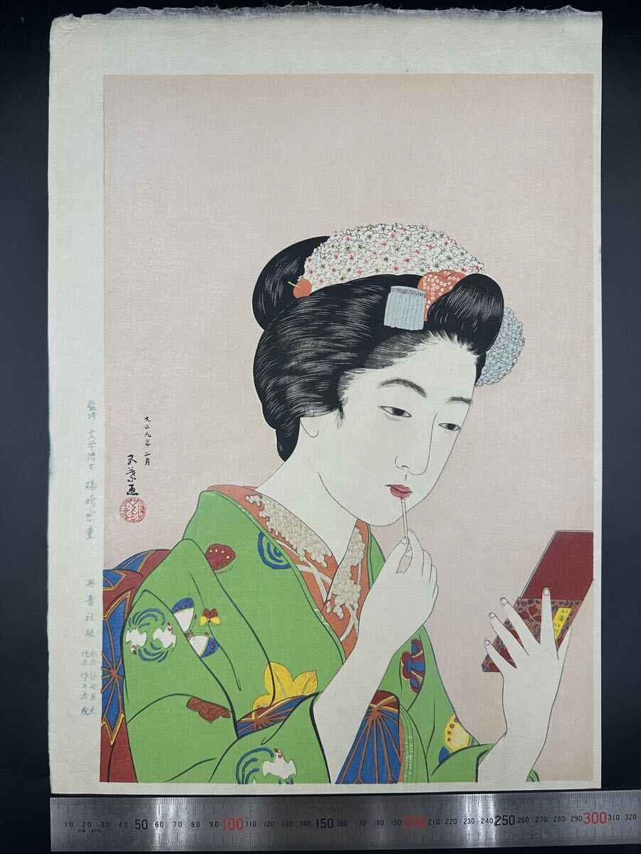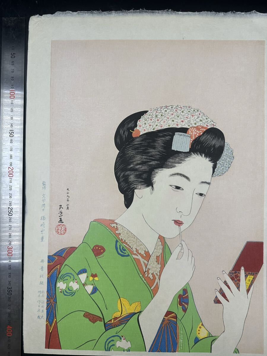 【真作】大正期 浮世絵木版画 橋口五葉「紅筆を持てる女」美人画 大判 錦絵 保存良い