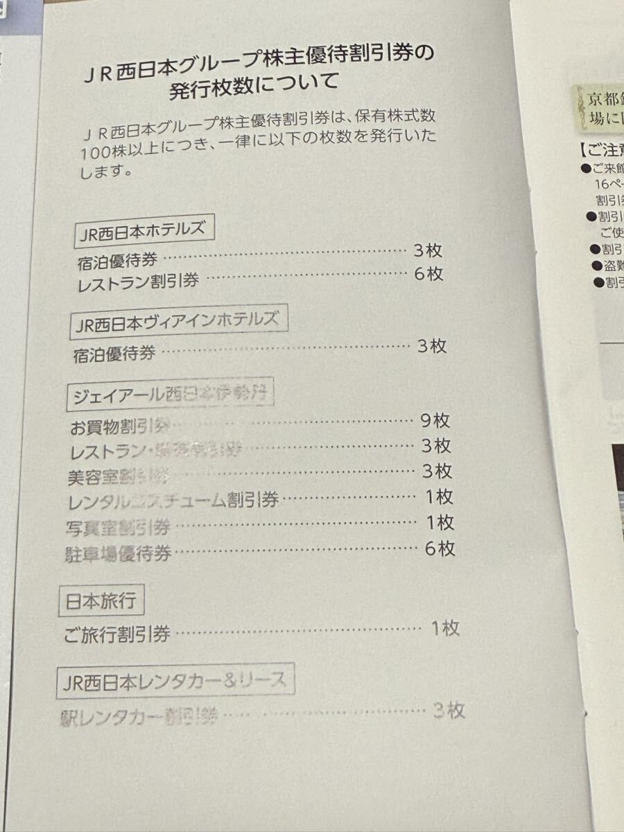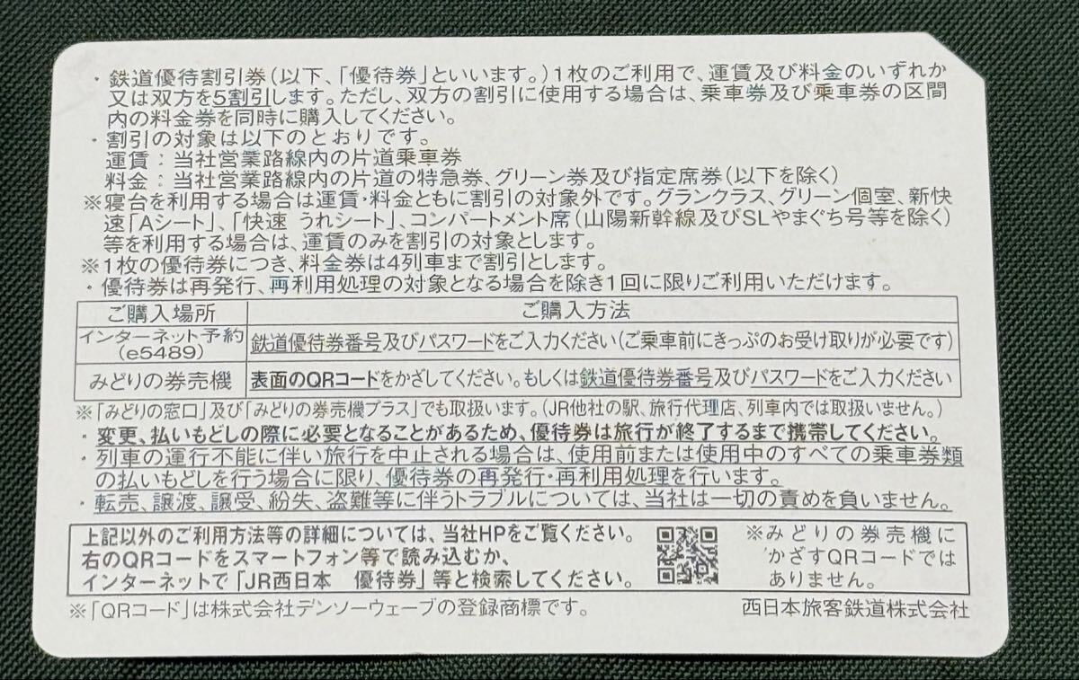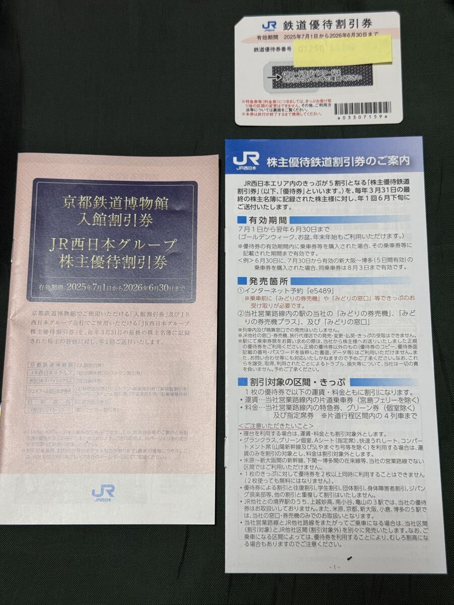 西日本旅客鉄道(JR西日本)の株主優待券1枚及び京都鉄道博物館入館割引券、JR西日本グループ株主優待割引券冊子1冊のセットです。