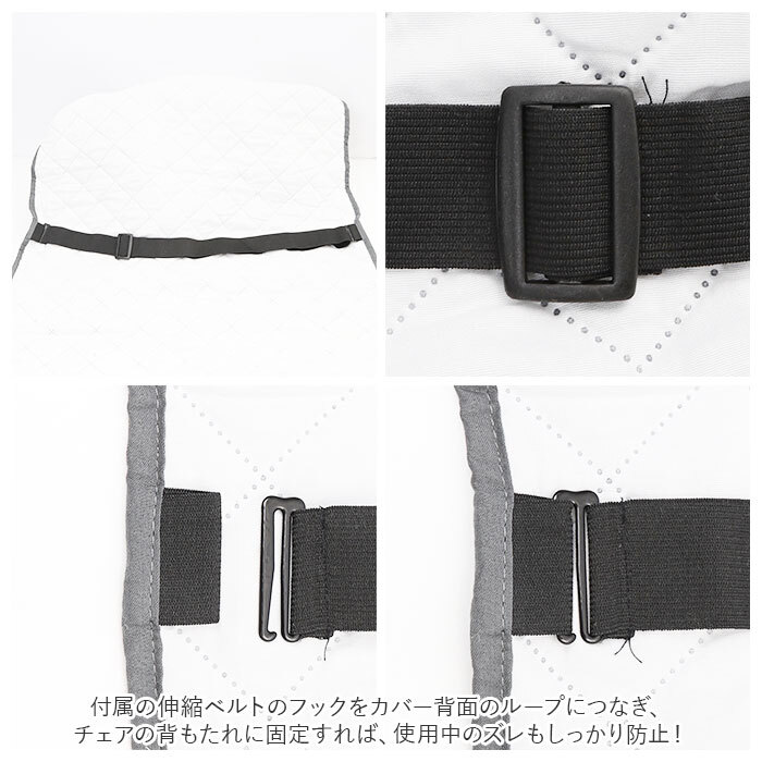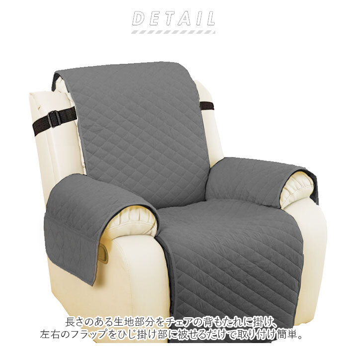 | 商品説明 | ・・リビングの1人掛け用のソファや、リクライニングチェアにサッと掛けて使えるチェアカバー。 ・長さのある生地部分をチェアの背もたれに掛け、左右のフラップをひじ掛け部に被せるだけで取り付け簡単。 ・付属の伸縮ベルトのフックをカバー背面のループにつなぎ、チェアの背もたれに固定すれば、使用中のズレもしっかり防止! ・汚れが目立ちやすいひじ掛け部分や、擦れキズが気になる足元部分もしっかりカバー。 ・頻繁に来客のある応接室のソファなどに掛けておけば、ソファのファブリック生地の汚れが気にならず安心。 ・ワンちゃんやネコちゃんがいるご家庭では、引っかきキズや抜け毛対策に大活躍!大切なペットと寛いで過ごしたい方に最適。 ・両サイドのフラップの裾は、それぞれ3つに仕切られたオープンポケットになっているので、テレビのリモコンやスマホなど手元に置いておきたい小物の収納に便利。 ・微かな光沢のあるポリエステル繊維に、ダイヤ型のステッチが上品な仕上がり。汚れが気になる場合は手軽に丸洗いができるのも嬉しいポイント。 |