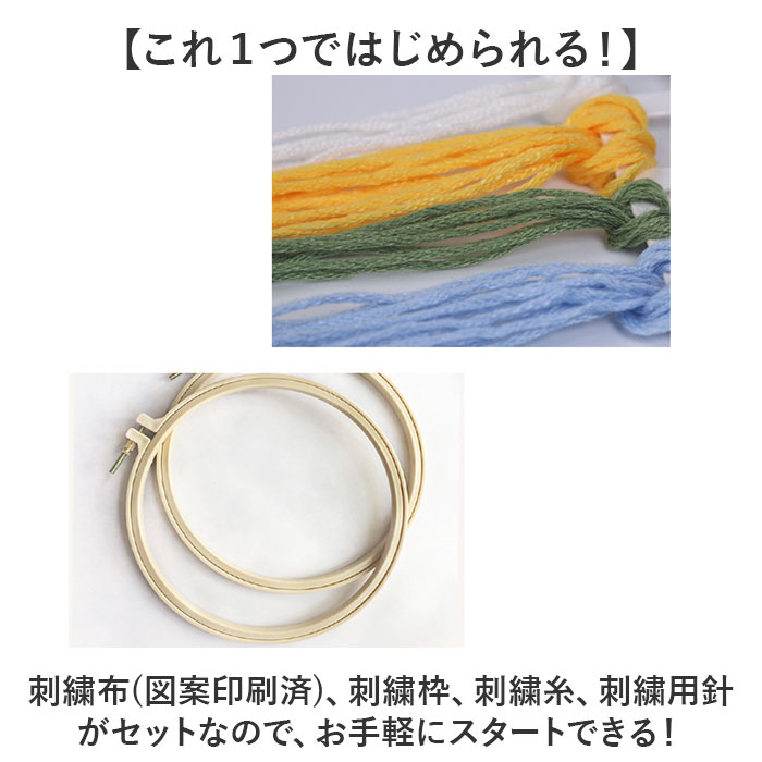 注意点 | ※※【セット内容】 ※・刺繍用布(図案印刷済)・刺繍枠・刺繍糸・刺繍用針x 2本・説明書 ※ ※お取り扱いの際は、商品やパッケージなどに記載されている品質表示、アテンションタグ、ご使用上の注意事項などを必ずご確認下さい。 ※本来の目的以外にはご使用にならないで下さい。 ※カメラやモニターの性質により、画像と実物の色の違いがある場合がございますのでご理解願います。 |
