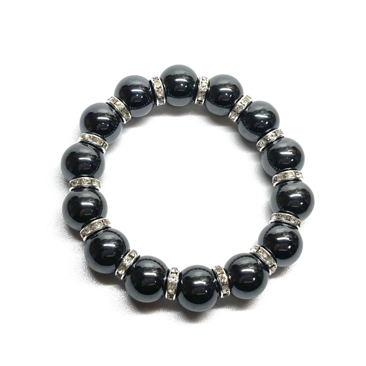 こちらは、14mm玉のヘマタイトを使用した天然石ブレスレットです。石との間にはロンデルを挟み高級感を演出しています。シンプルなデザインですのでどんなコーディネートとも合わせ易いブレスレットです。石大きさは14mm玉です。内周約17cmです。パワーストーンを付けてる方へのプレゼントにもお勧めです。14mmサイズのリクエストが多々ありましたので少量ですが販売しました。気になる方はお早めにどうぞ。