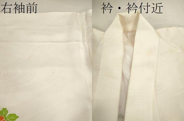着物【正絹】の状態は接写画像のように右袖前・衿・衿付近薄い汚れがございますが その他特に目立ったシミ汚れなどもなく大変良い状態です。 大変上質な逸品になります。 お安く出品致しますので、是非この機会にいかがでしょうか? ※左の紐はありません。 ※袖が大名袖になっております。 |