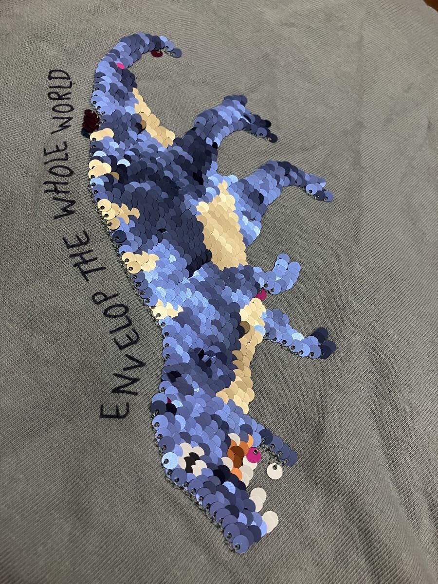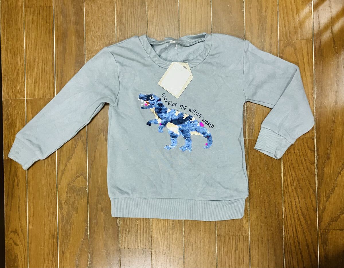 新品タグ付きのスパンコール長袖トレーナー110cmです☆スパンコールはお色が変わります(スパンコールはシャンパンゴールド系の青やピンクやゴールドでとても綺麗なお色です)☆恐竜好きのお子さんにおすすめです☆お色はグレーです☆同じ服のサイズ違いを別に出品致しておりますので、お友達やご兄弟でリンクコーデが楽しめます☆返品、クレームはお受けできません☆この他にも子供服など、いろんなものを多数出品致しておりますのでよろしかったらご覧下さい^ - ^