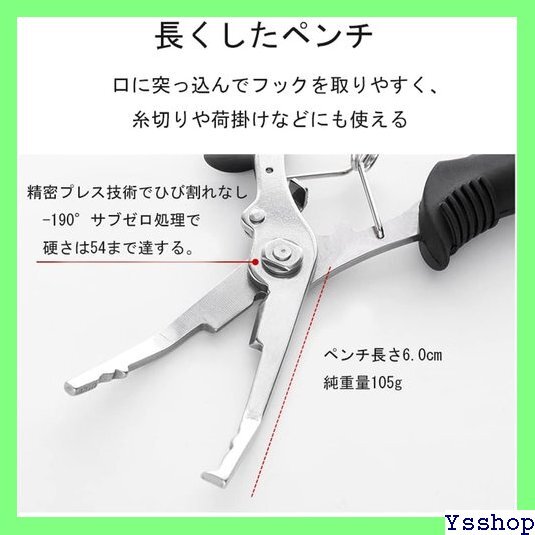 【魚に優しい】プライヤー 釣りの特殊なデザインは、魚の歯や深く釣った魚からフックを簡単に取り外すことができます。小さい魚口に向かって、飲み込んだ針でも安全に取り出せます。魚の口をしっかりと固定することができます。釣り上げた魚を安全につかむことができ、記念撮影をする時などにも活躍します!!