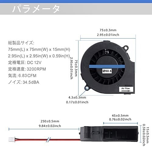 GDSTIME 75mmx15mm 12V DC ブロワーファン、冷却ファン 遠心ファン、シロッコファン ブラシレスファン、スリーブベアリング 商品詳細 寸法: 75mm (L) x75mm (W) x15mm (H) /2.95in (L) x2.95in (W) x0.59in (H) パラメータ:定格電圧:12V、定格電流:0.2A、定格速度:3200RPM、風量:6.83CFM、騒音:34.5dBA ベアリング: スリーブ ベアリング、25 度で最大 35000 時間動作 パッキング: ファン2個、ネジとナット付き