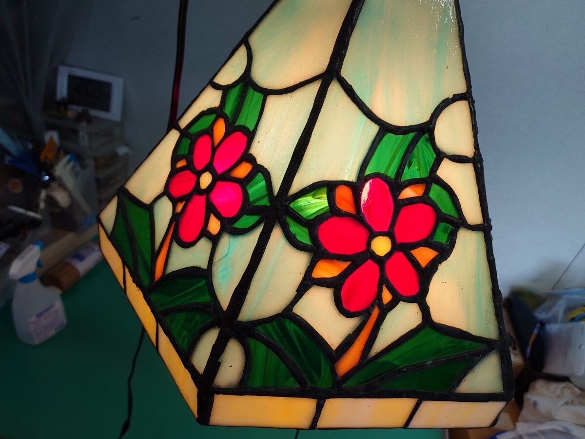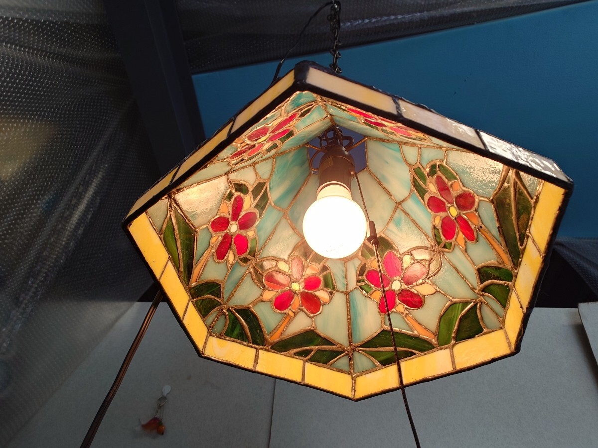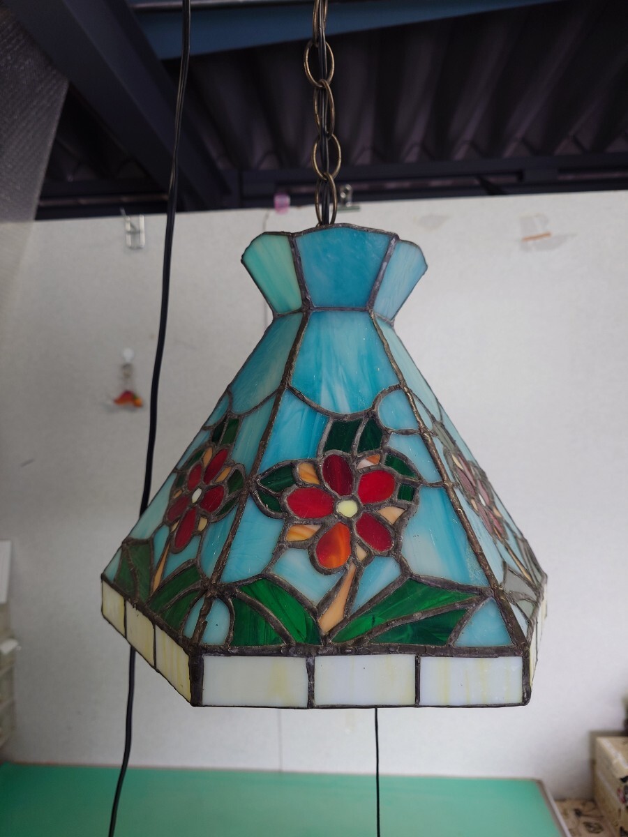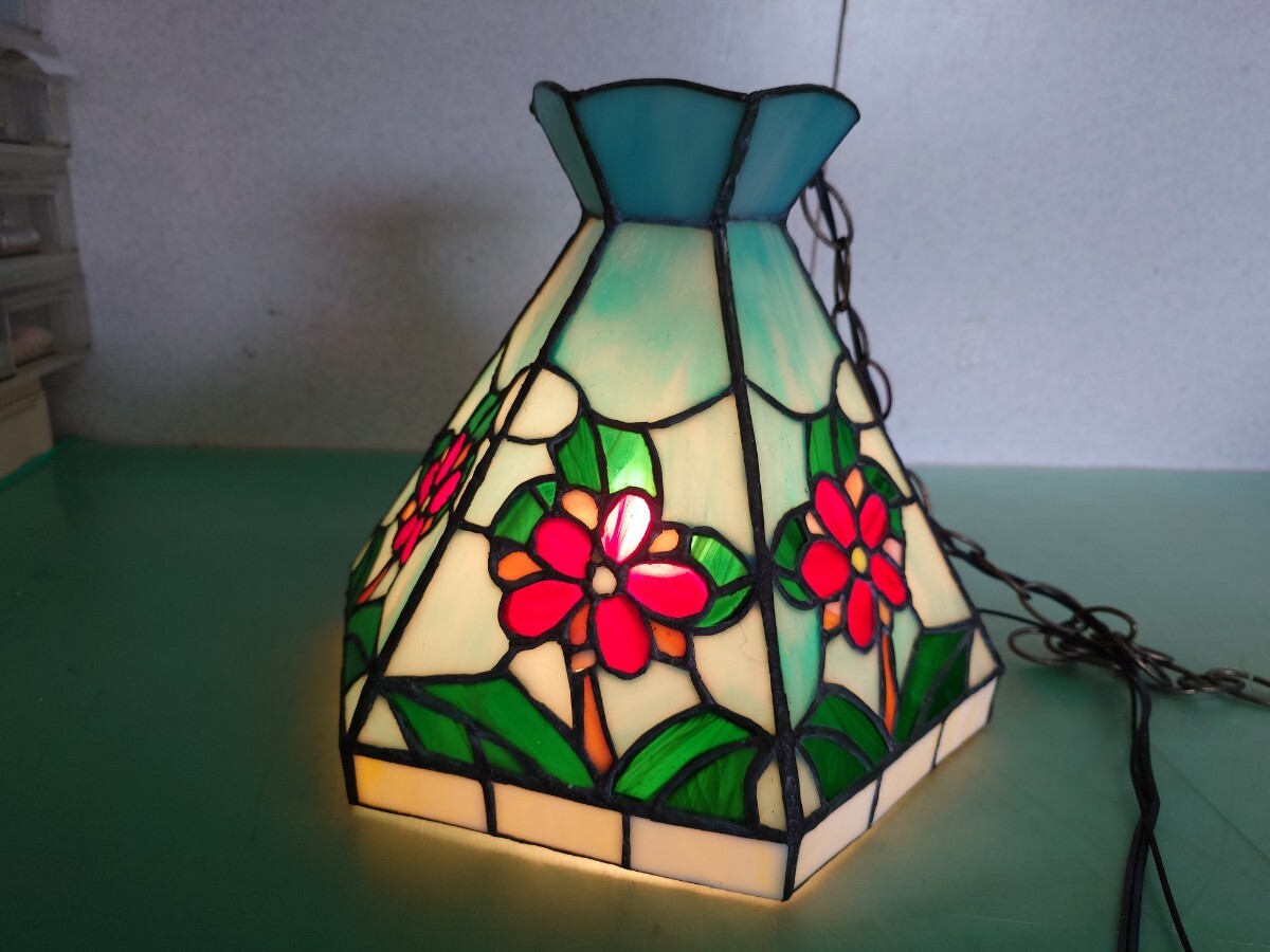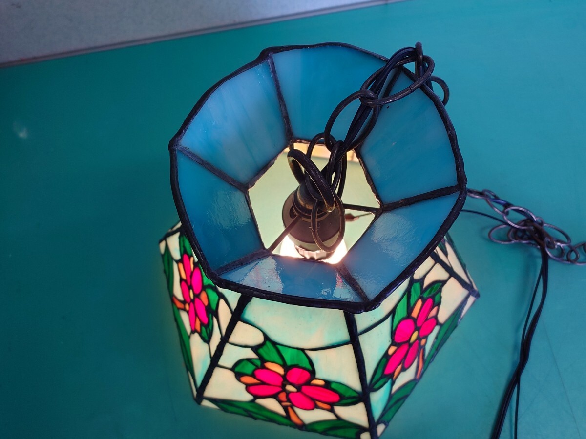 ● ステンドグラス フラワー ランプ 吊り下げ ペンダント ライト ガラス シェード 照明器具 マーブル/ブルー/赤/グリーン アンティーク調 ハンドメイド 中古 ④