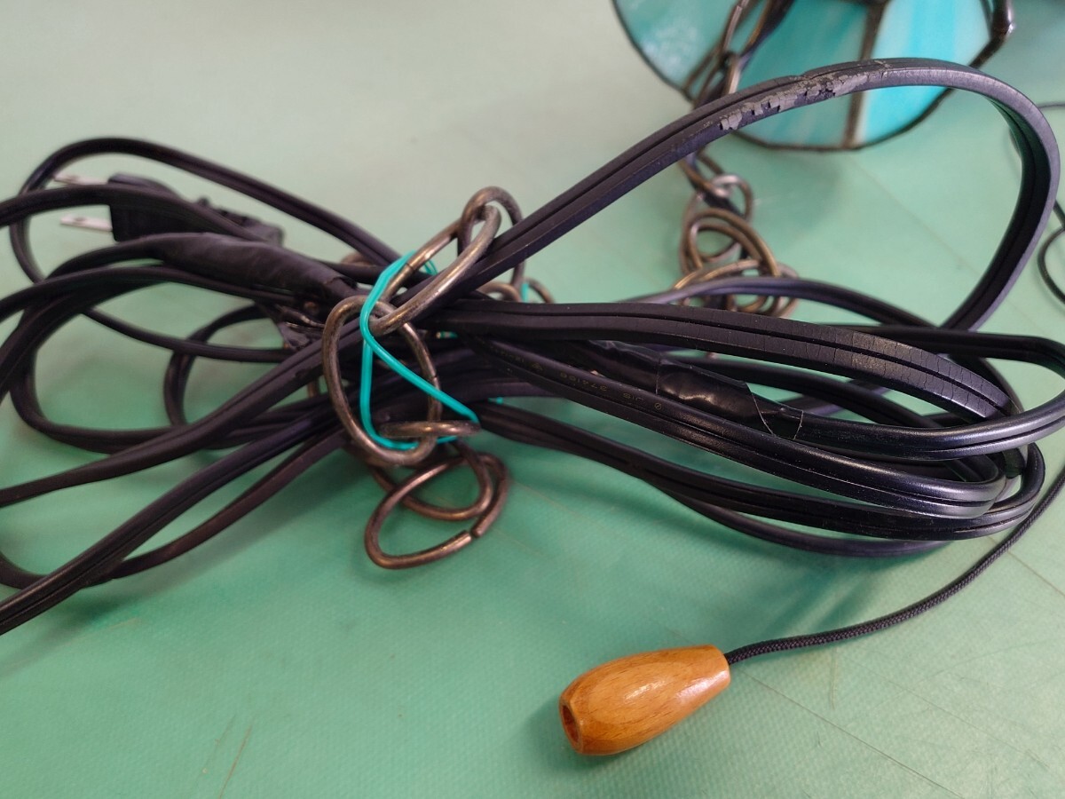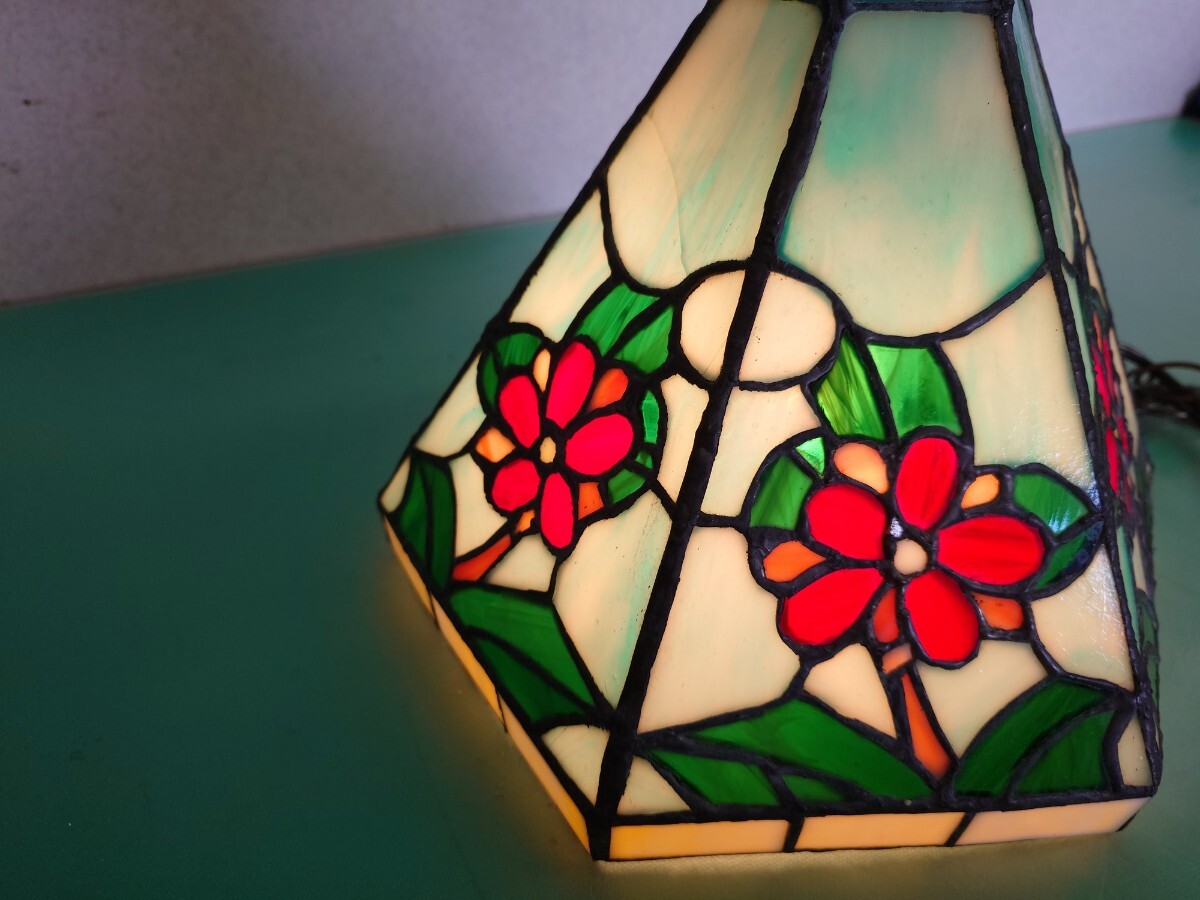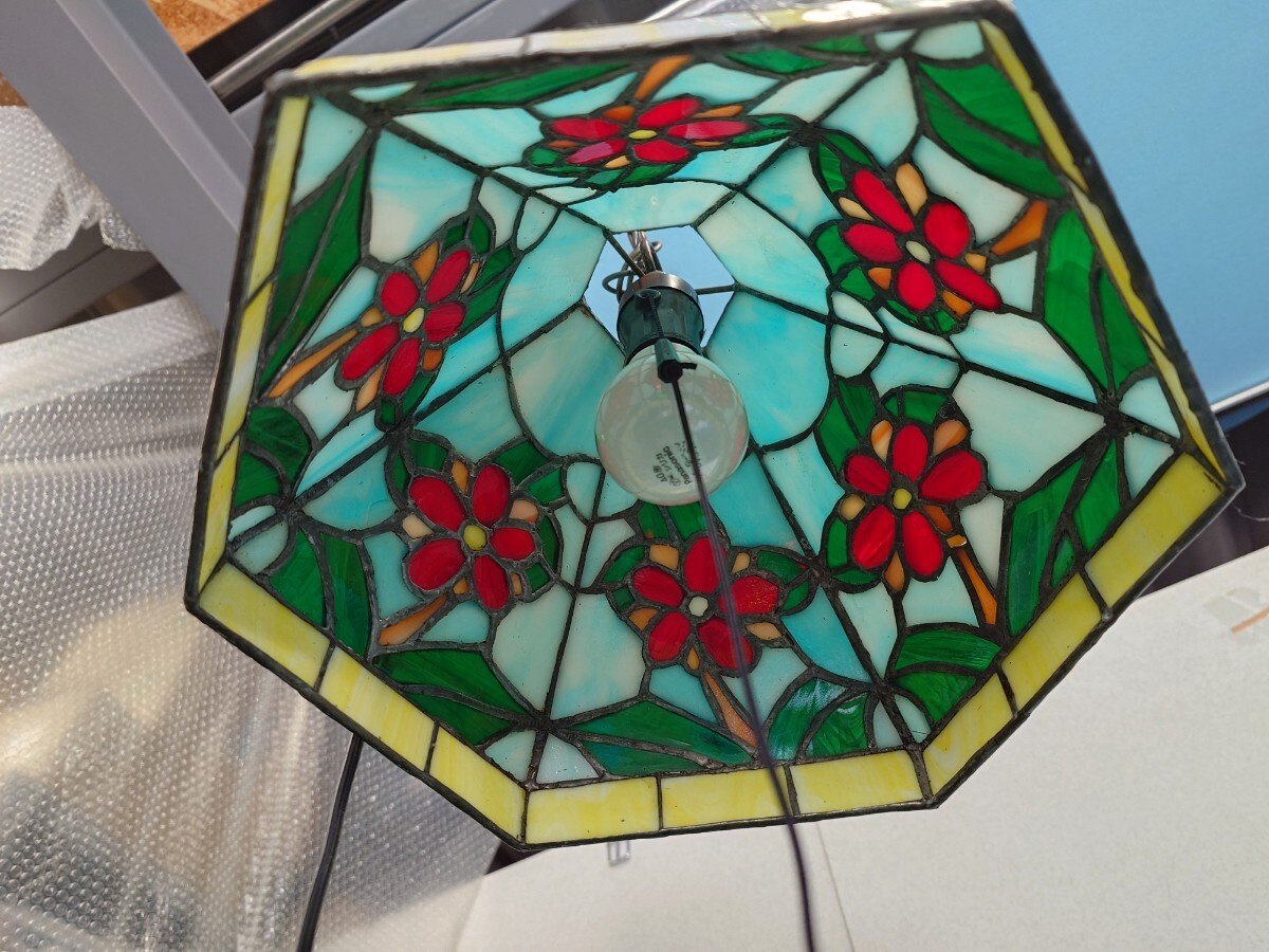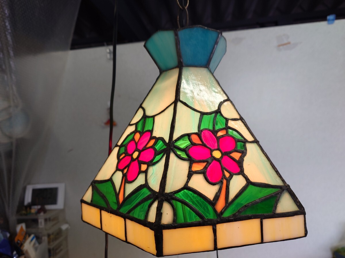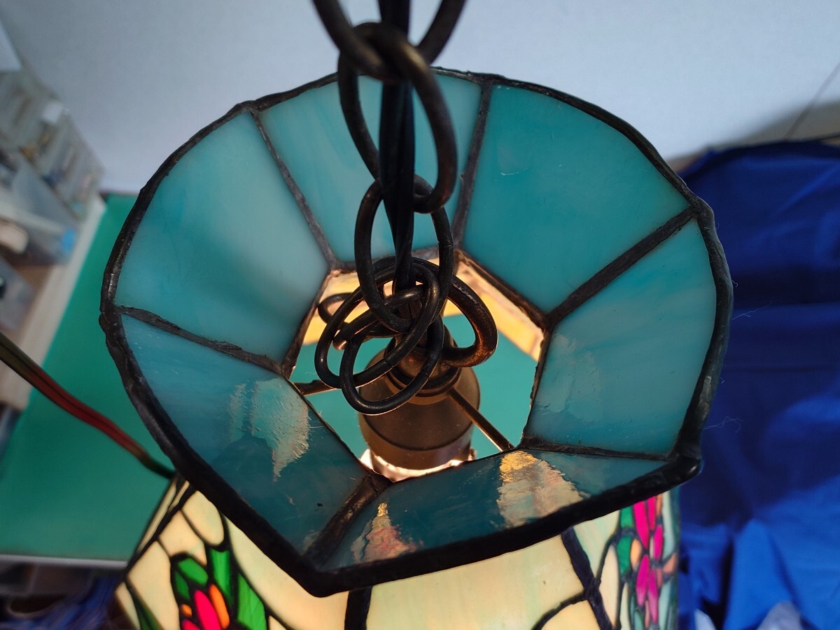 ● ステンドグラス フラワー ランプ 吊り下げ ペンダント ライト ガラス シェード 照明器具 マーブル/ブルー/赤/グリーン アンティーク調 ハンドメイド 中古 ④