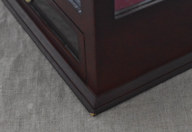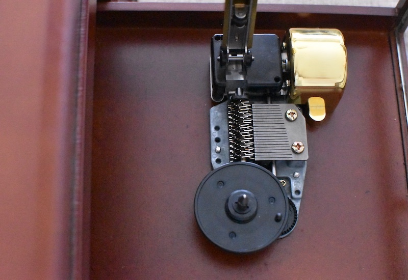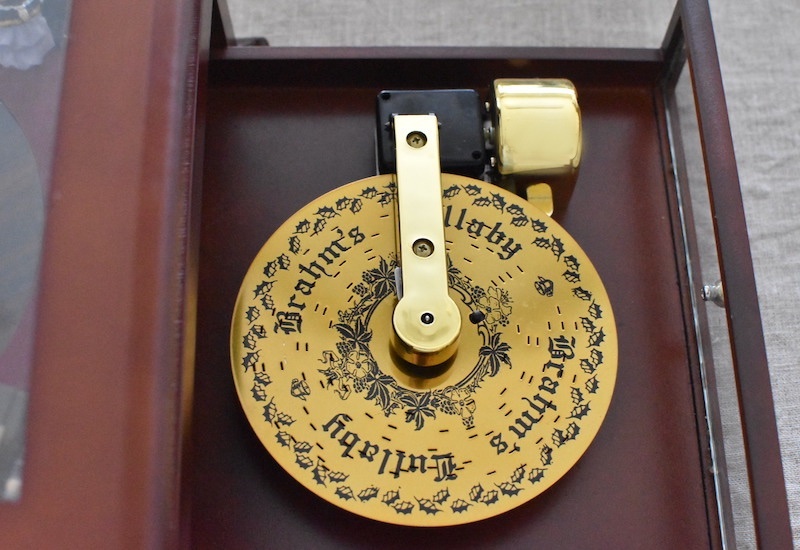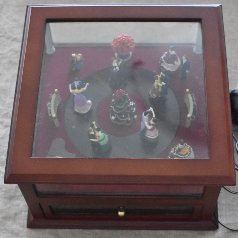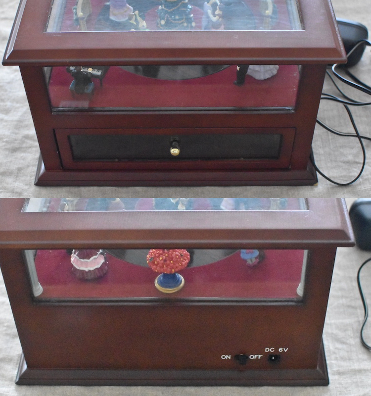 【コンディション】動作確認済ですが、長らくしまってあったものなので、全体的に経年感などはあると思います。箱から出した際、オルゴールを鳴らす歯車の部分に若干ですが錆のようなものがありました。布で拭いたらだいたい落ちたとは思いますが、多少残っているかもしれません(写真6枚目参考)。オルゴールの音にはとくに問題はないように思いますが、素人の判断ですのでその旨ご了承ください。本体の下部、角にぶつけたように見える箇所があります(写真9枚目)。ショーケースのガラス内側にも多少汚れ、曇りなどがあるように思います(内側は清掃できるか分からないのでそのままになっています)。箱の状態はよくありません。説明書には経年によるシミが見られます。ほかにも見落としはあるかもしれません。古い品ですので、その旨ご承知おき下さい。コンディションを重視される方は念のためご遠慮下さい。