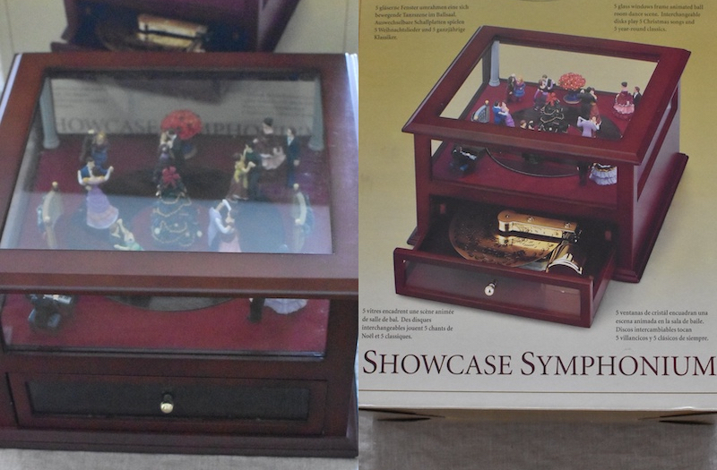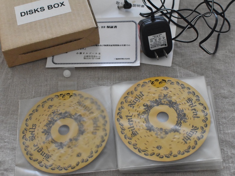 ミスタークリスマス(三協)の電動式のディスクオルゴールです。流したい曲のディスクを入れて、付属のACアダプターを差し込み、背面のスイッチを入れると動作します。曲が流れると、ケースのなかで人形たちが回ります。クリスマス曲5枚、クラシック曲5枚の、計10枚のディスクが付属しています。曲目は写真10枚目をご参照下さい。