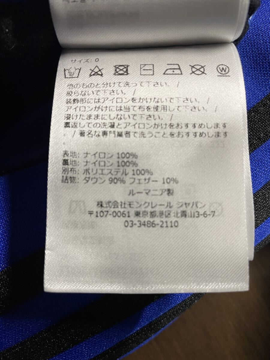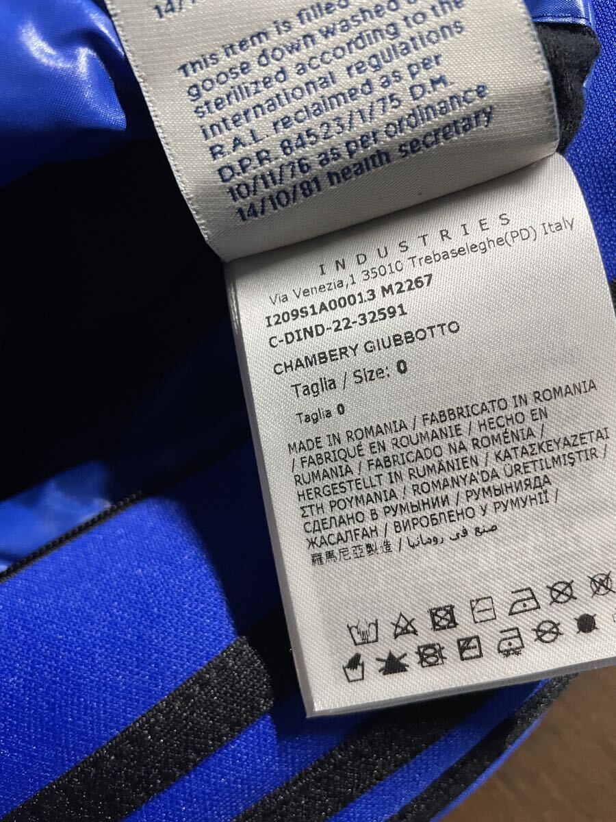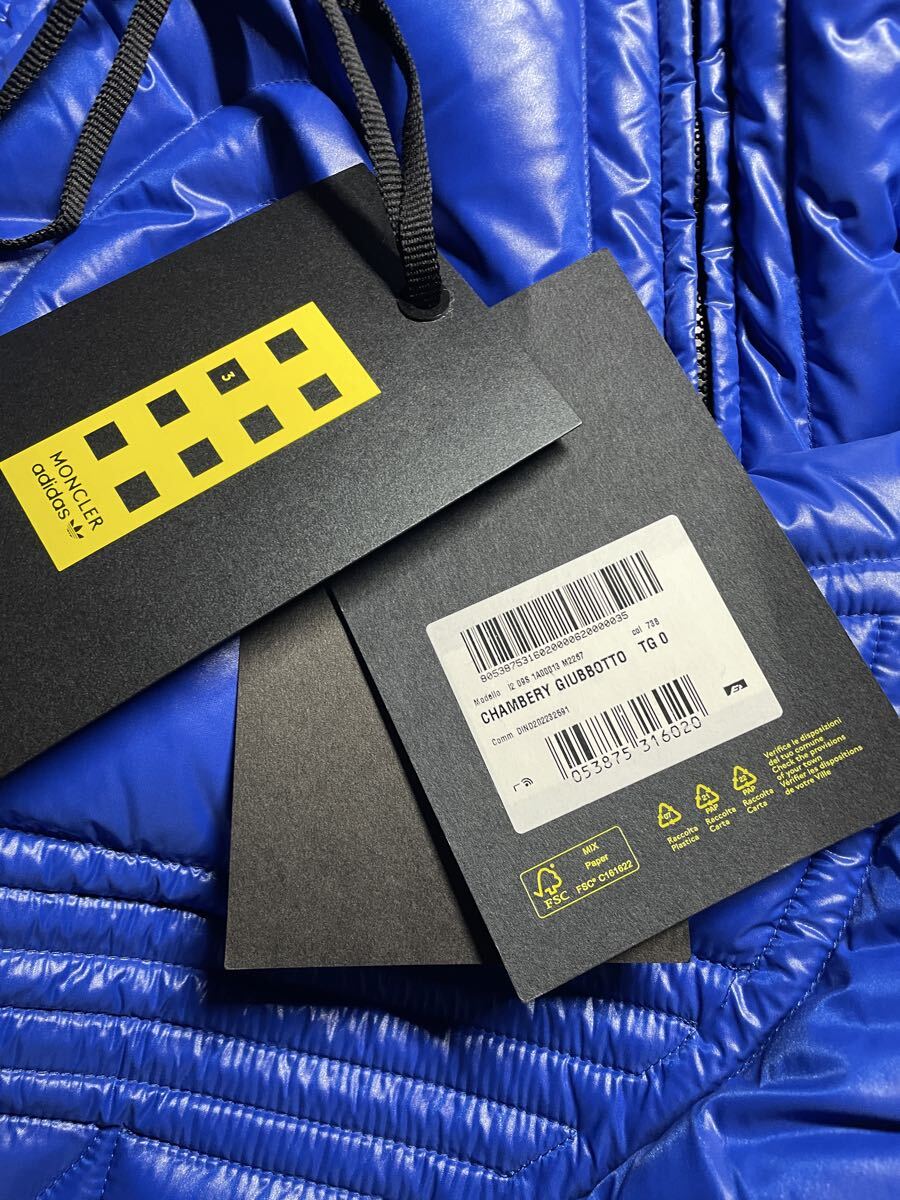 モンクレール×アディダス CHAMBERYダウン、サイズ0、ブルー、美品、認証タグあり、定価372900円。