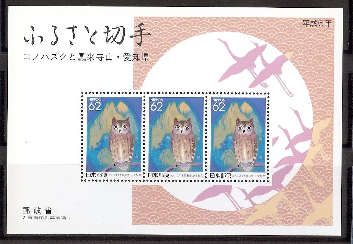 平成5年お年玉ふるさと切手3小型シート コノハズク・愛知県