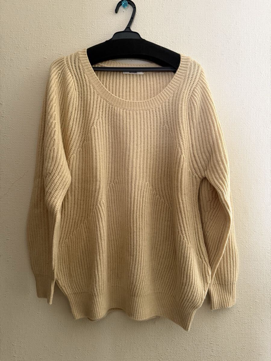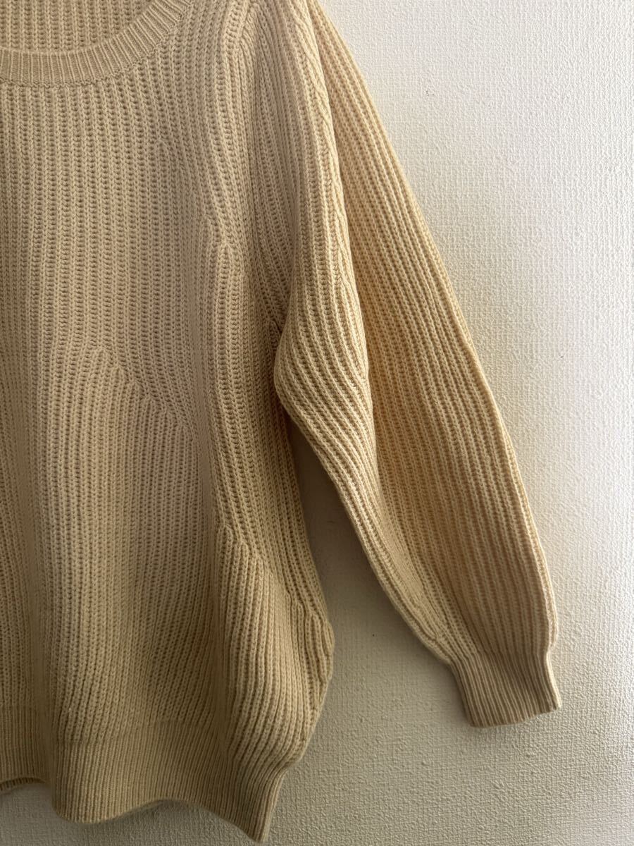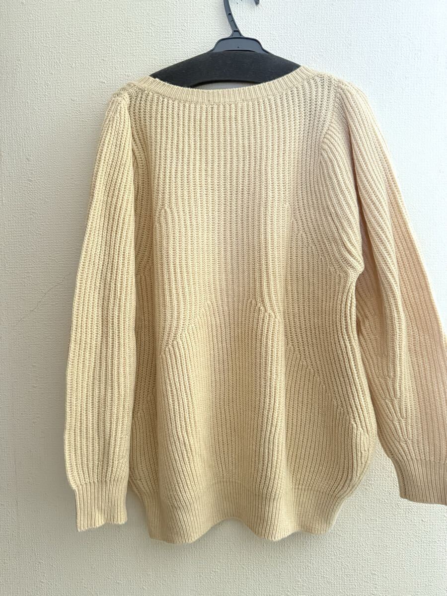 ゆったり感のあるニットでしっかりしています。おしりが隠れる位の長さです。お色はベージュ系ですが黄色味のある優しい感じのお色です。