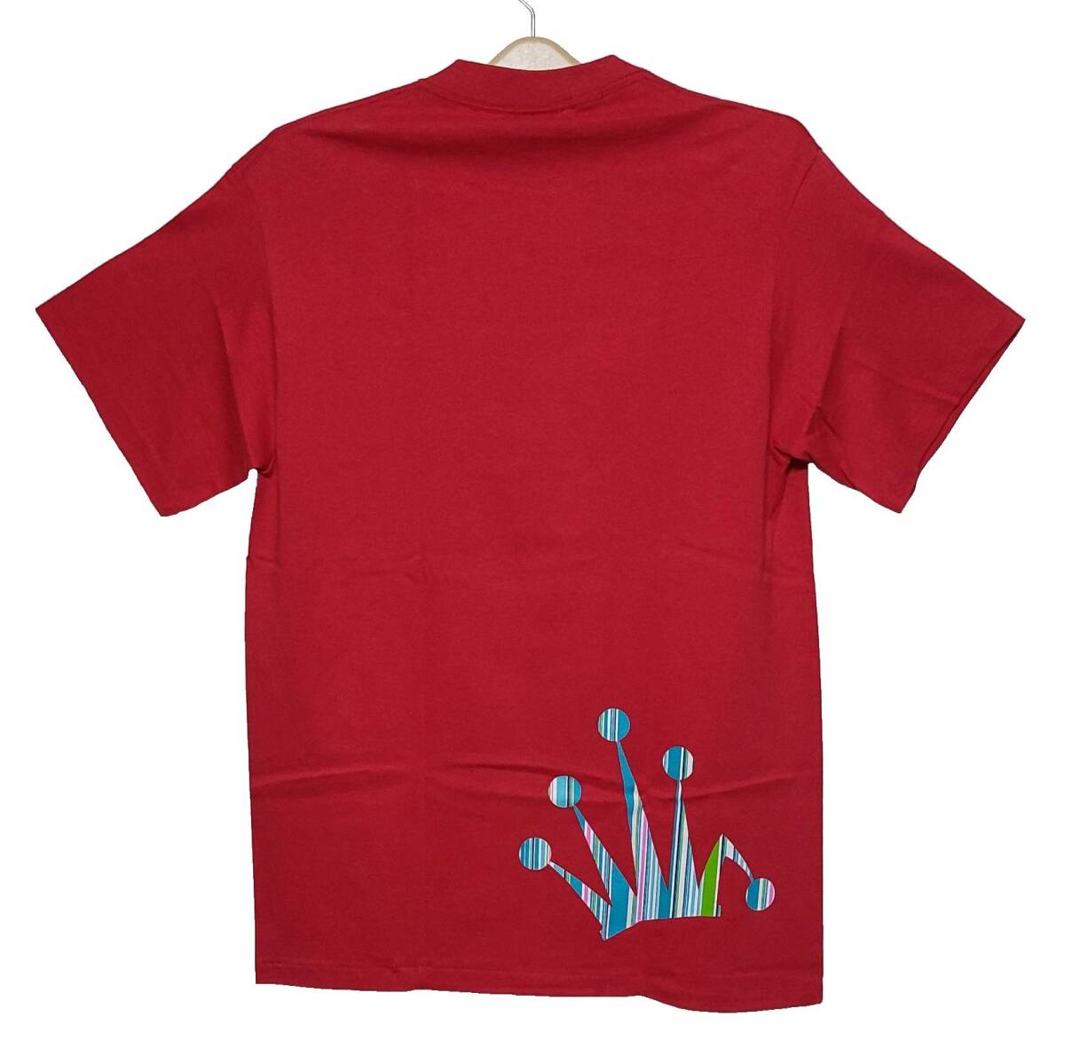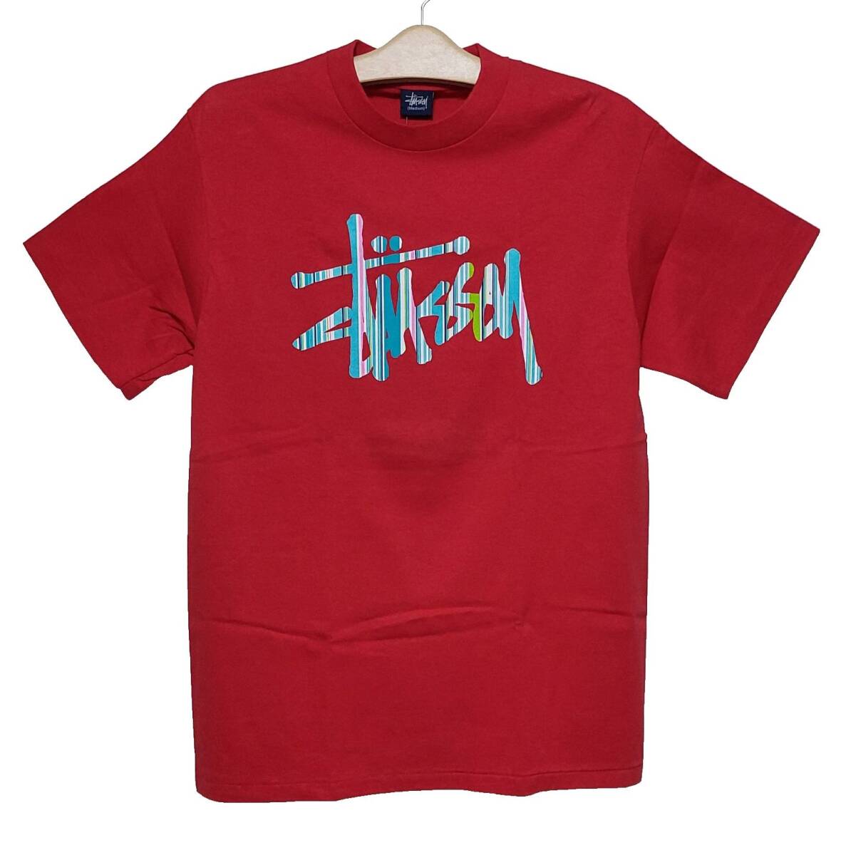 激レア超希少!新品タグ付き!STUSSY オールドステューシー 90,s紺タグ ロゴ王冠ストライプ柄プリントTシャツ M 赤レッド デッドストック