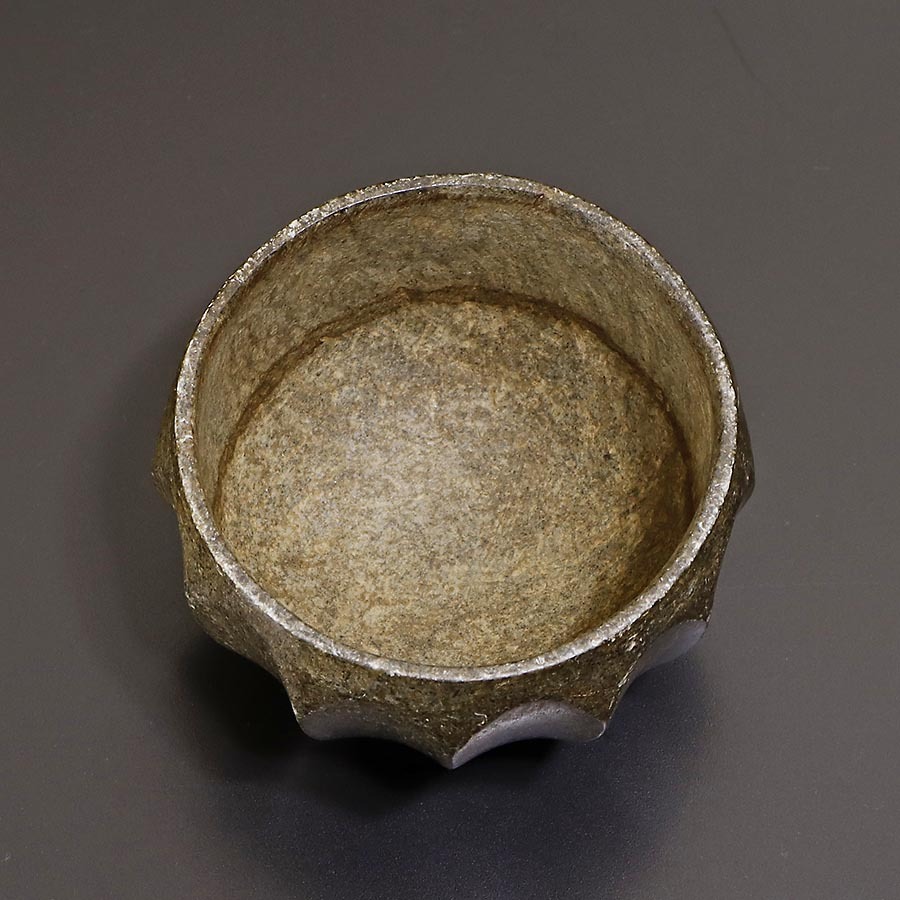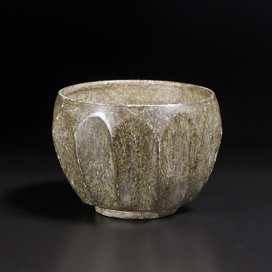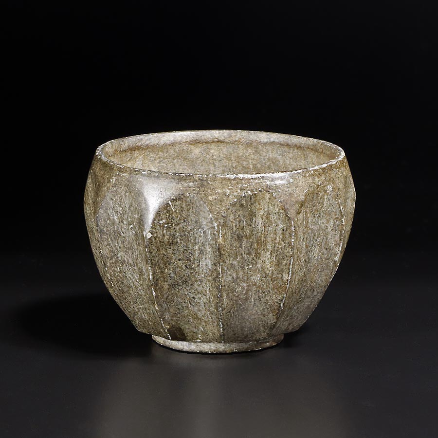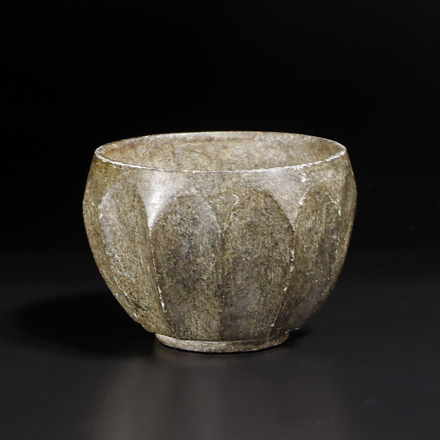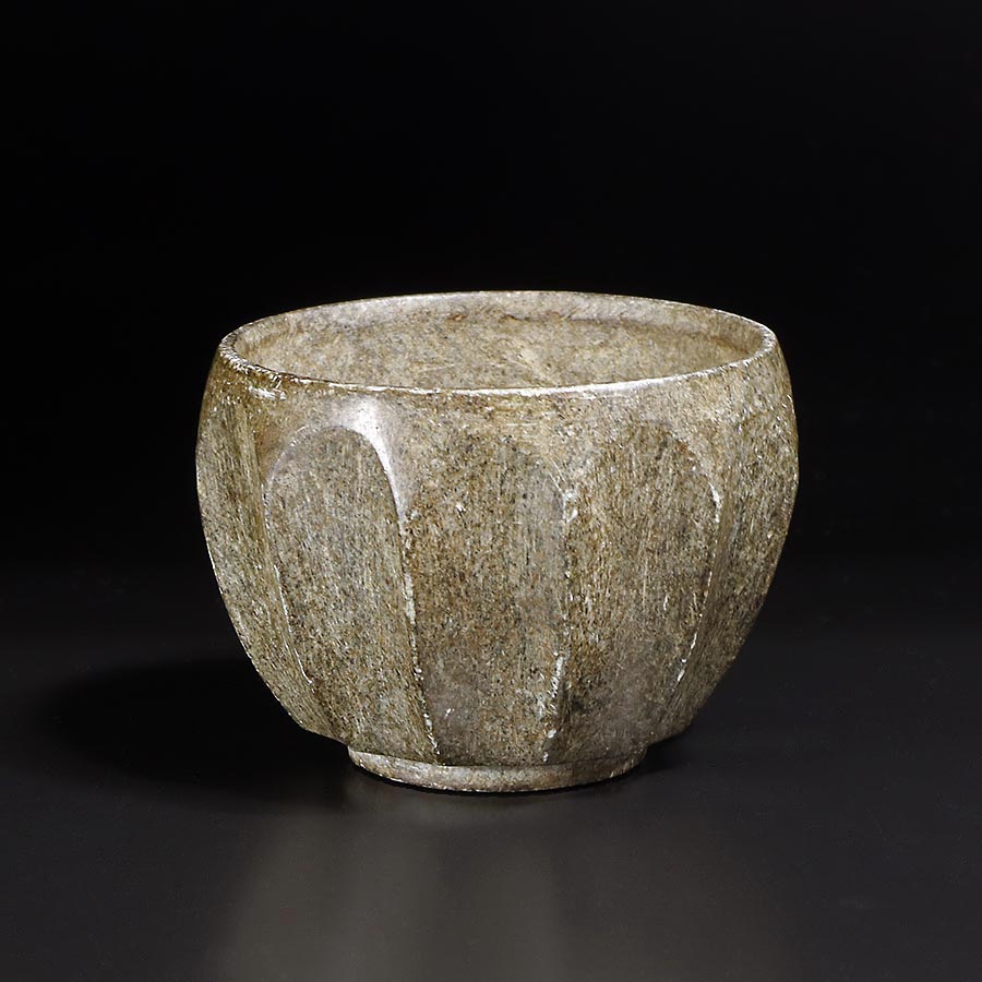 優美で味わい深い造形、石でありながら温かみのある肌合い…李朝工芸の魅力がよく現れた盃。手取りを軽くするためでしょう、胴部に施されたしのぎ文が作品を引き締めています(とはいえ手にすると重量感があります)。