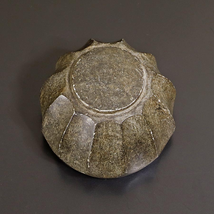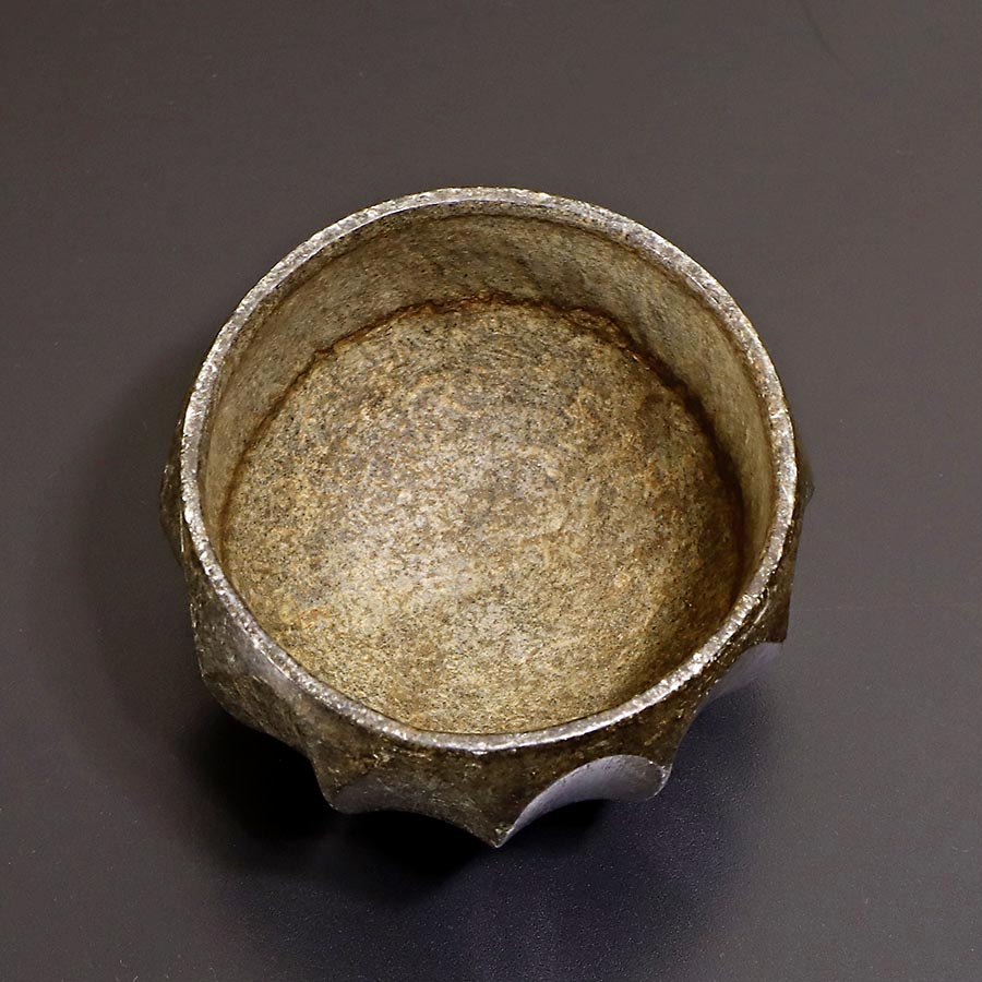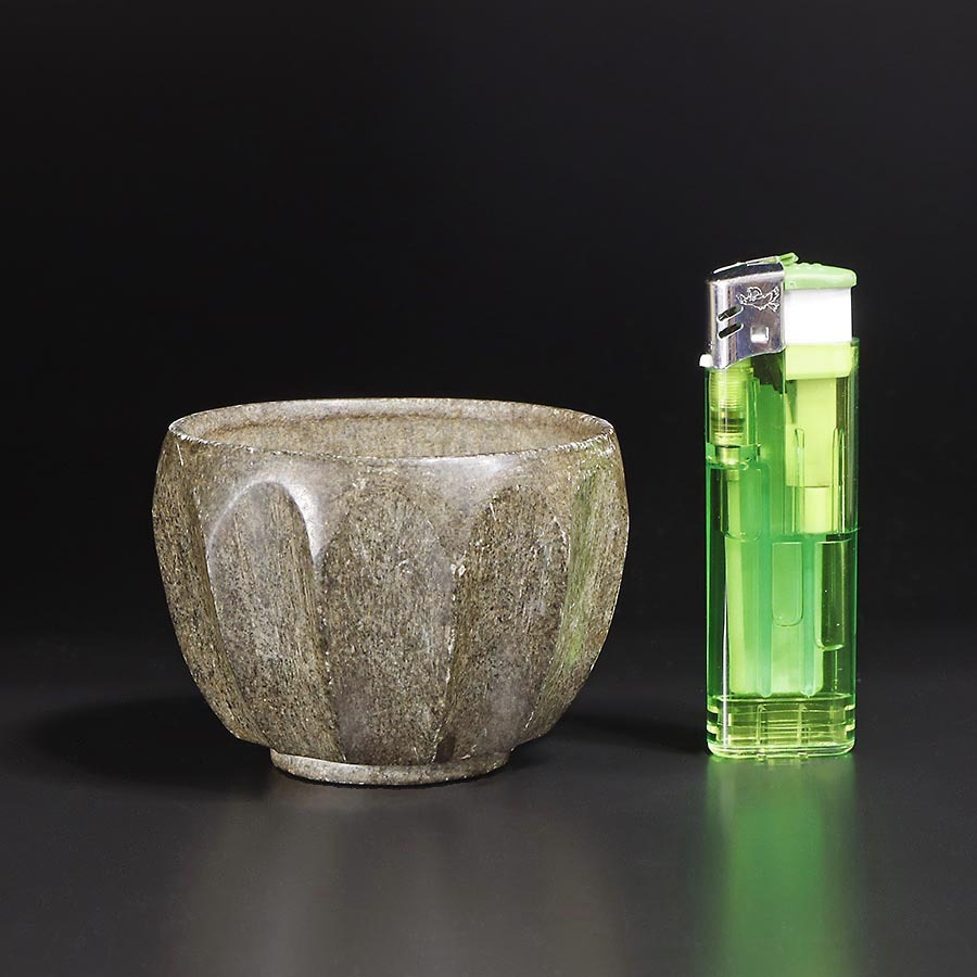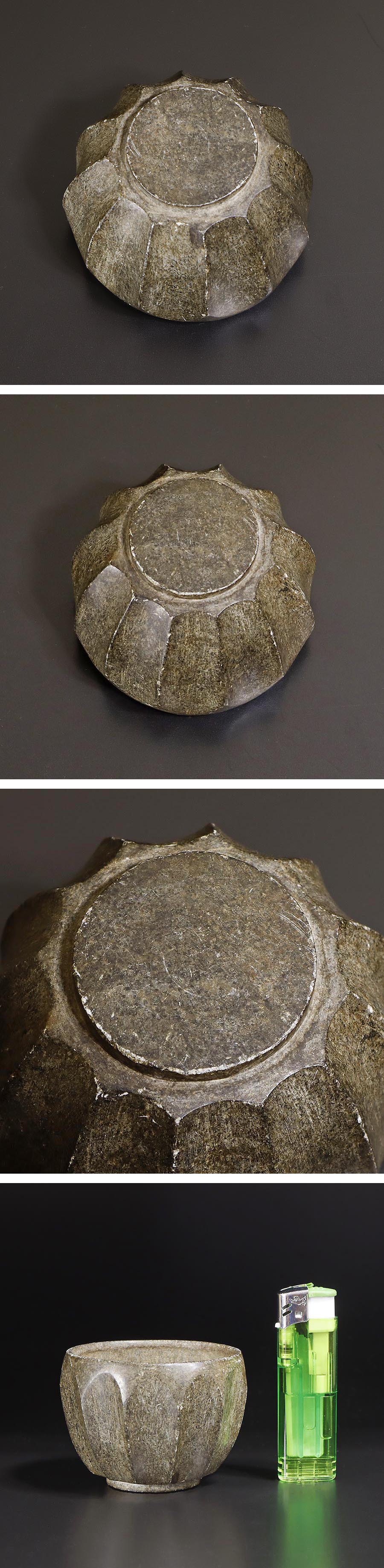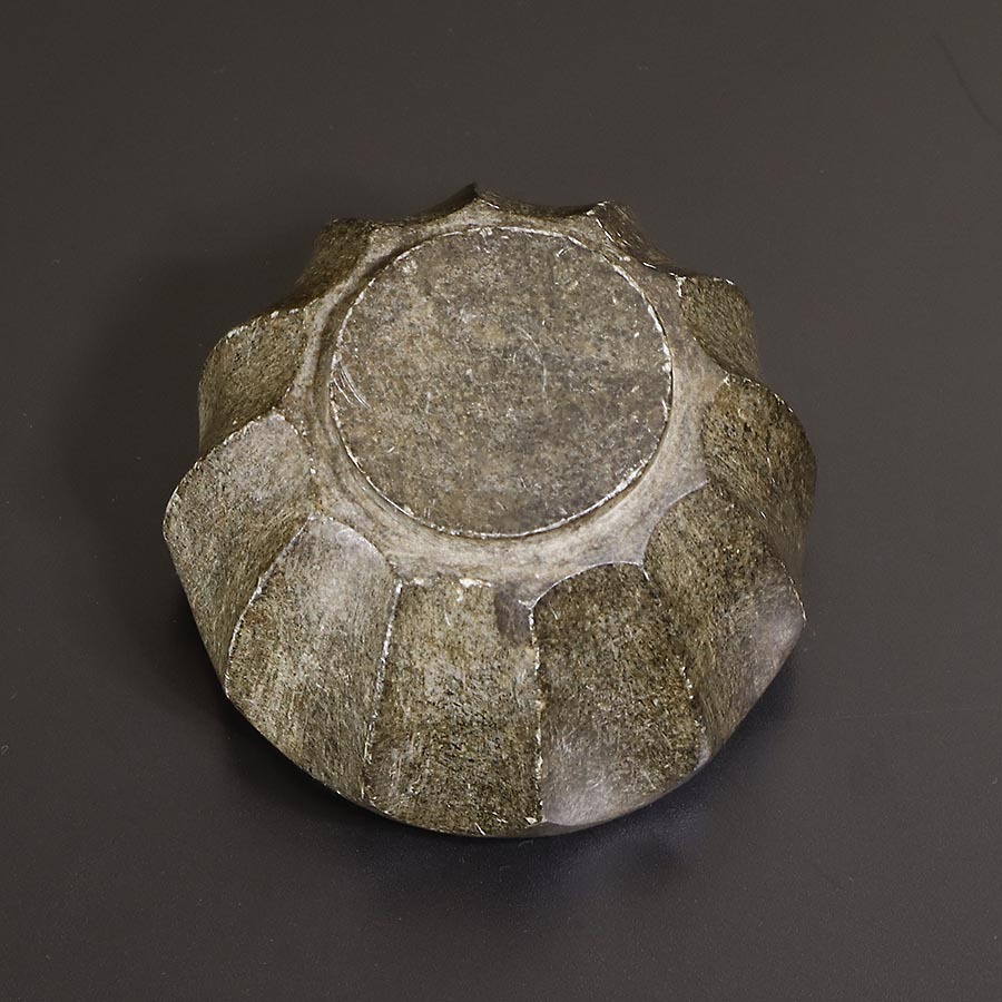 優美で味わい深い造形、石でありながら温かみのある肌合い…李朝工芸の魅力がよく現れた盃。手取りを軽くするためでしょう、胴部に施されたしのぎ文が作品を引き締めています(とはいえ手にすると重量感があります)。