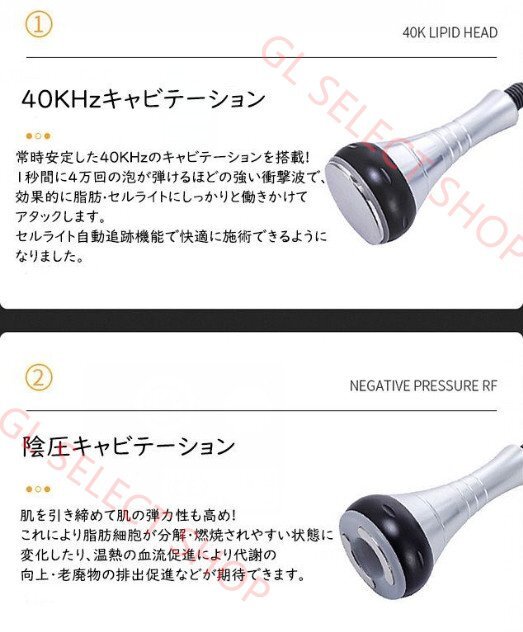 40kHzキャビテーション/負圧キャビテーション/ラジオ波/LEDの4機能を備えた多機能マシン。