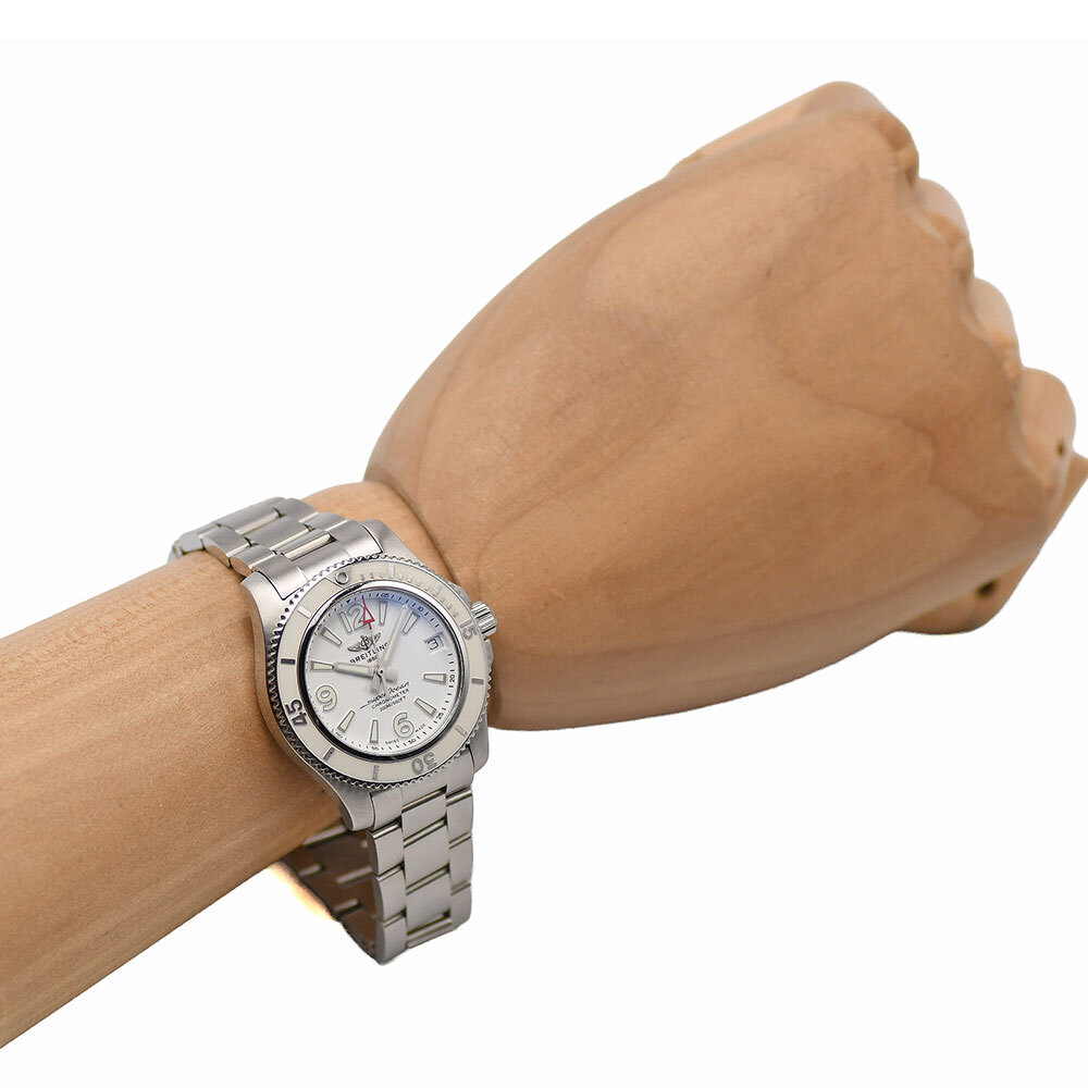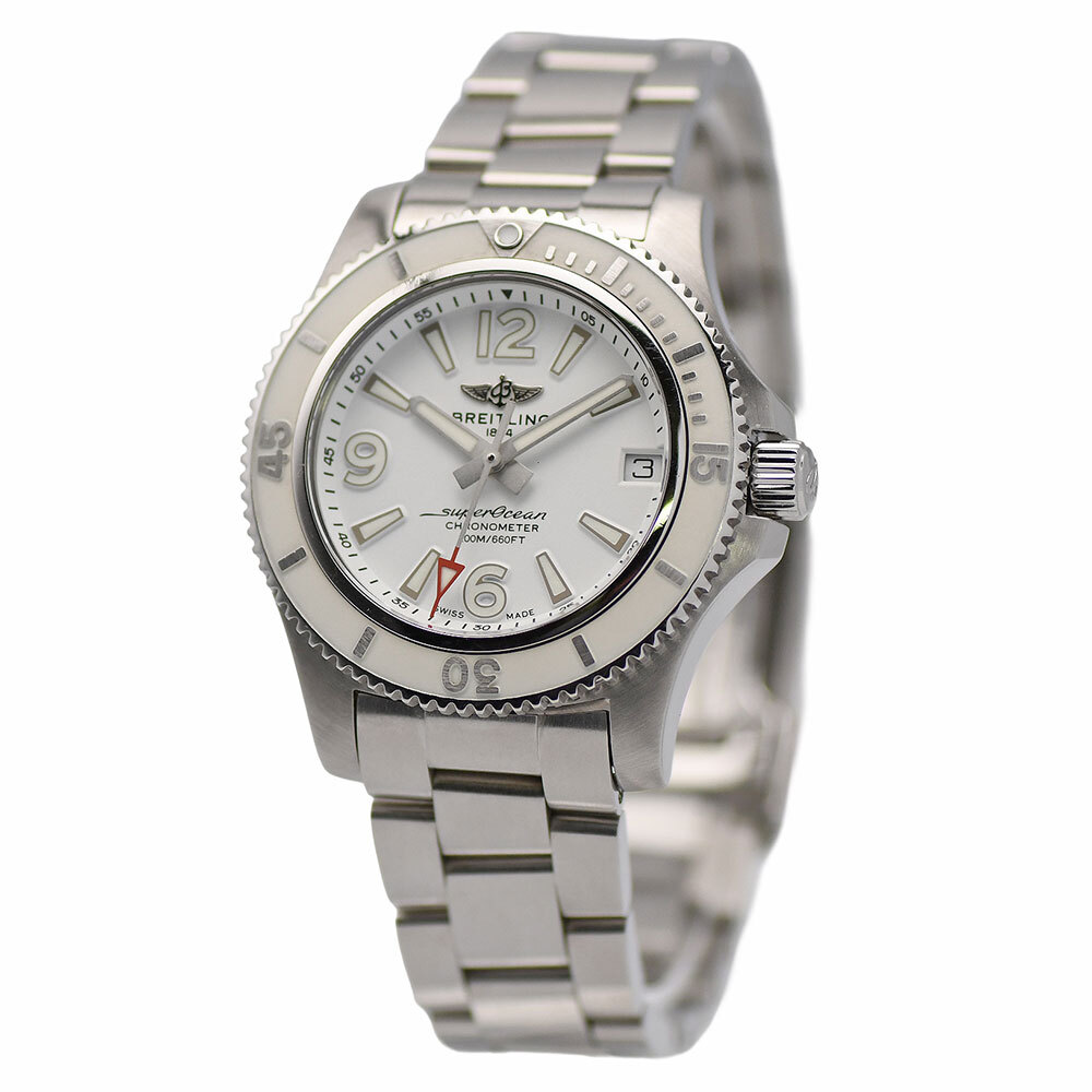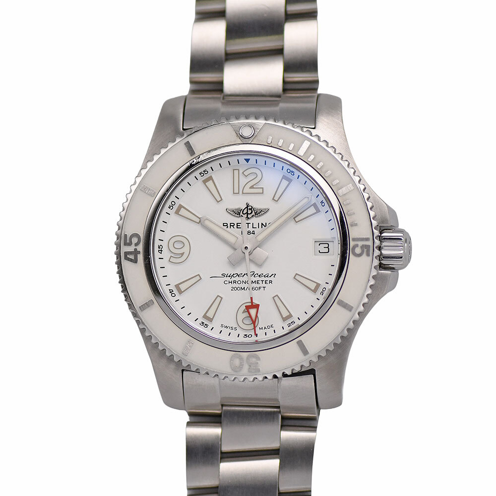 ブライトリングを代表するダイバーズコレクション『スーパーオーシャン』が入荷しました。クロノメーター認定の“ブライトリング17”搭載しています。爽やかな白文字盤のスポーツウォッチです。 |