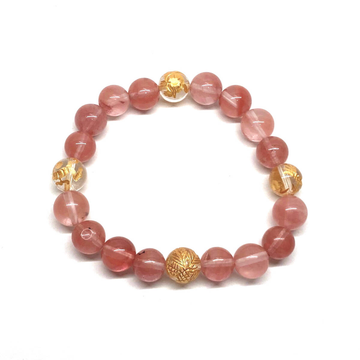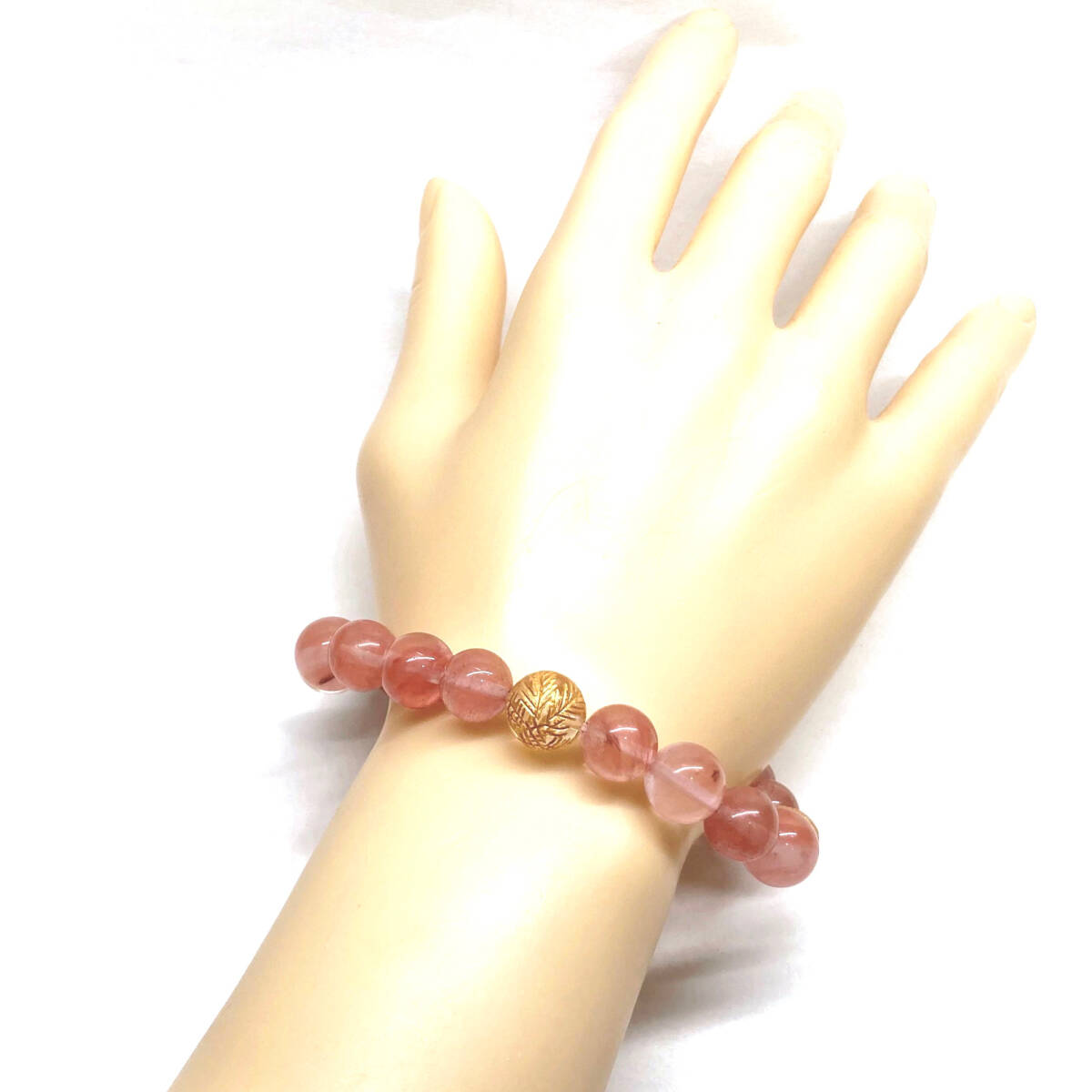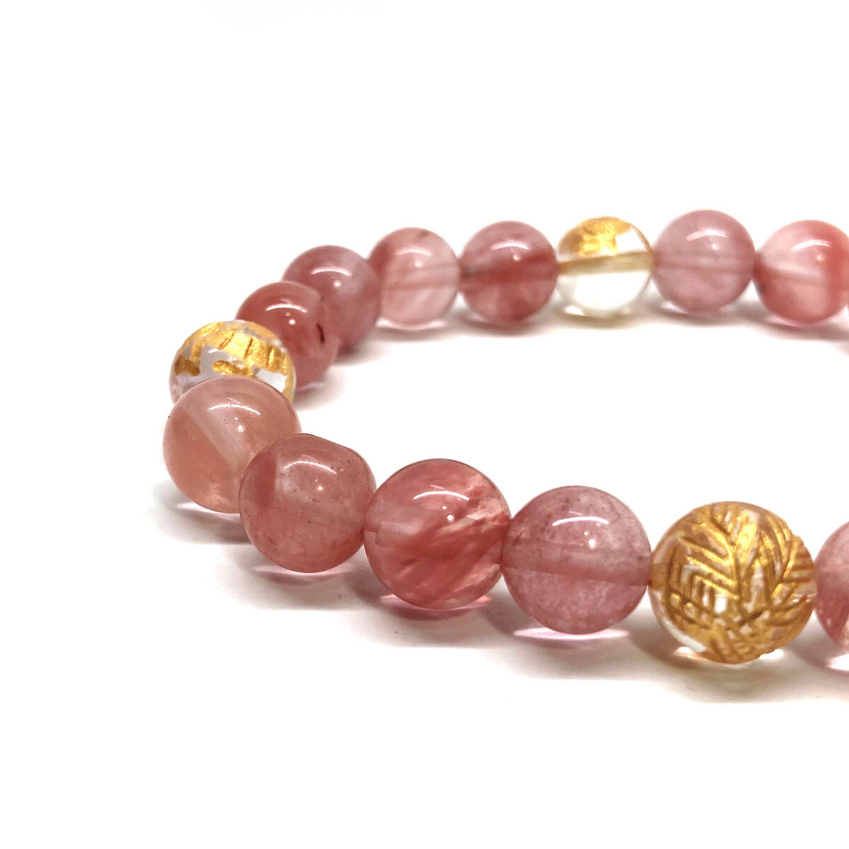 10mm 四神獣金彫水晶×チェリークォーツ パワーストーン ブレスレット 運気上昇 開運 金運 恋愛運 青龍 白虎 玄武 朱雀 ☆