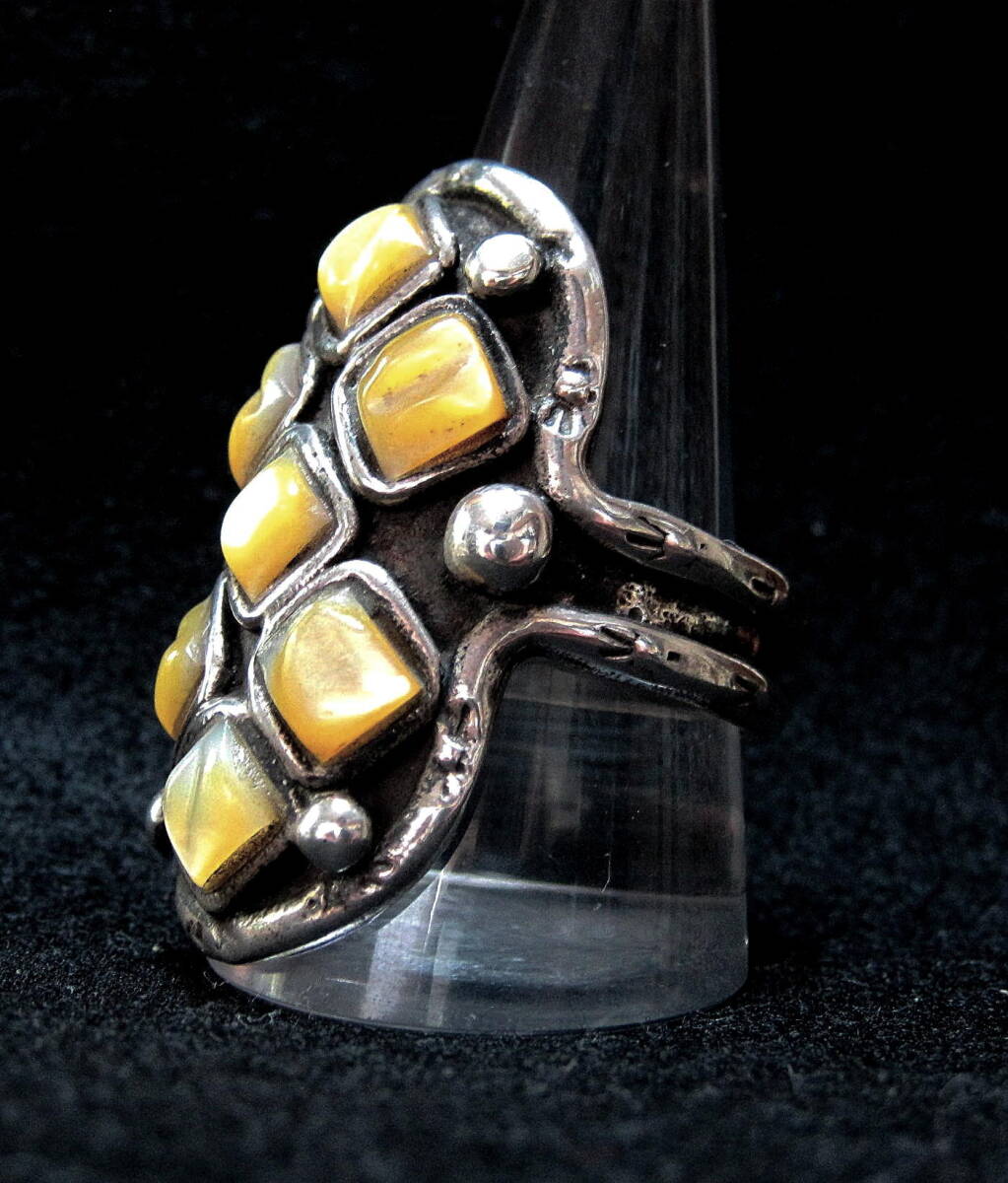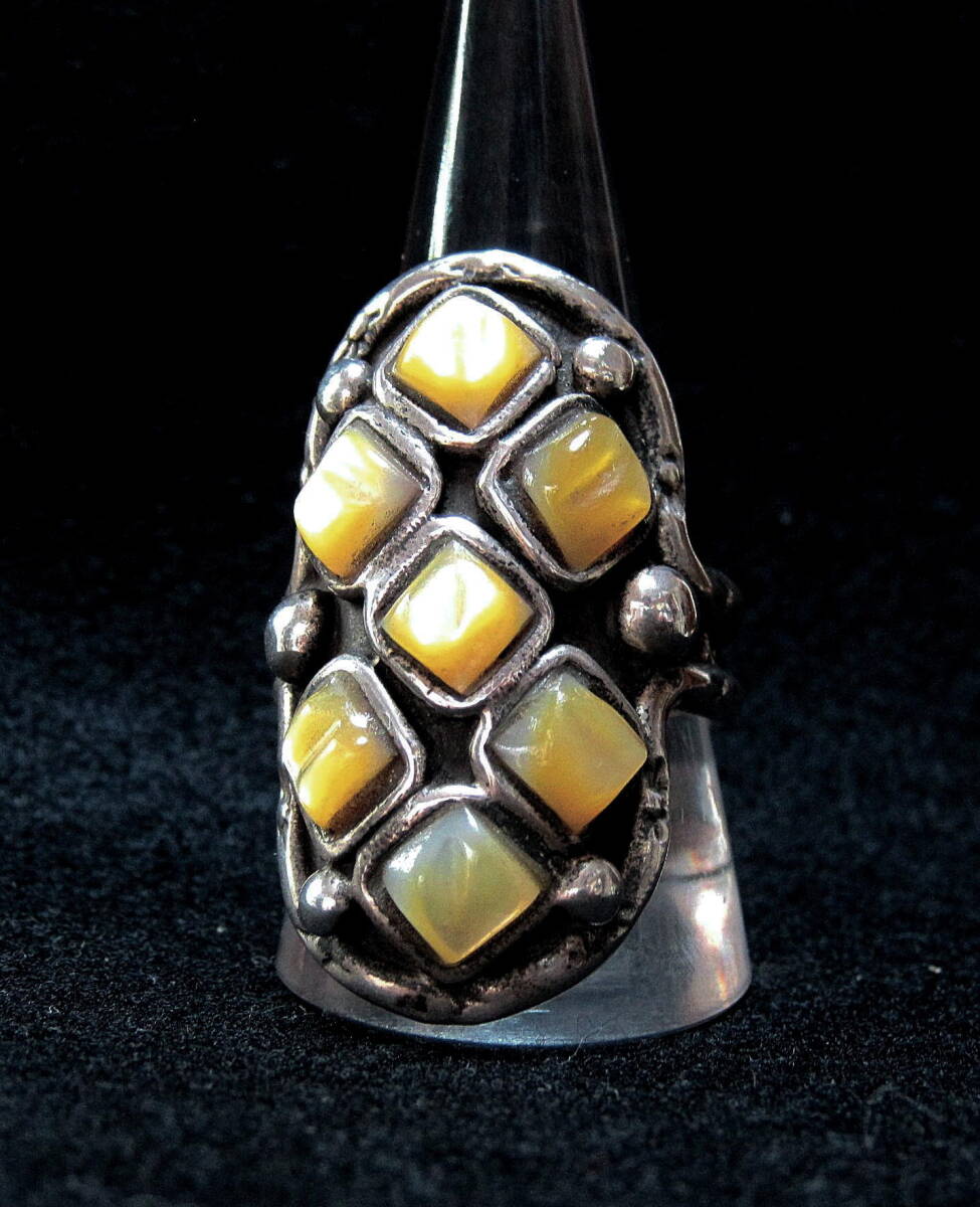 ナバホ族 Alex Begays作 ・ビンテージリング 1980年代品 ハンドメイドの極み, シルバー台に シルバーボール&マザーオブパール 7個配置したリング、、 年月をへだてて、、 いぶしシルバーがいい味出してます これぞビンテージの インディアンジュエリー!といったデザイン、、、 今時、、、 滅多にお目にかかれない逸品! ■商品詳細 ナバホ族; Alex Begays作 素材;シルバー&マザーオブパール (真珠貝)カラー ;クリーム(玉虫色) サイズ;26号 /台座; 縦38.8mm 横19.8mm 重さ;16.8g 1980年代品・新品 /Made in U.S.A./送料込 ビンテージリング、、、 ハンドメイドシルバー特有の スレ、燻が御座います 十分にご検討の上、 ご決断をお待ちしています。 | ||||