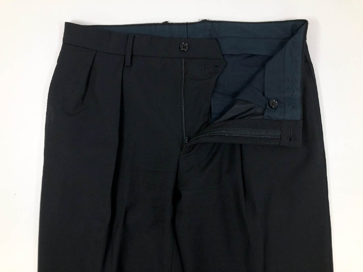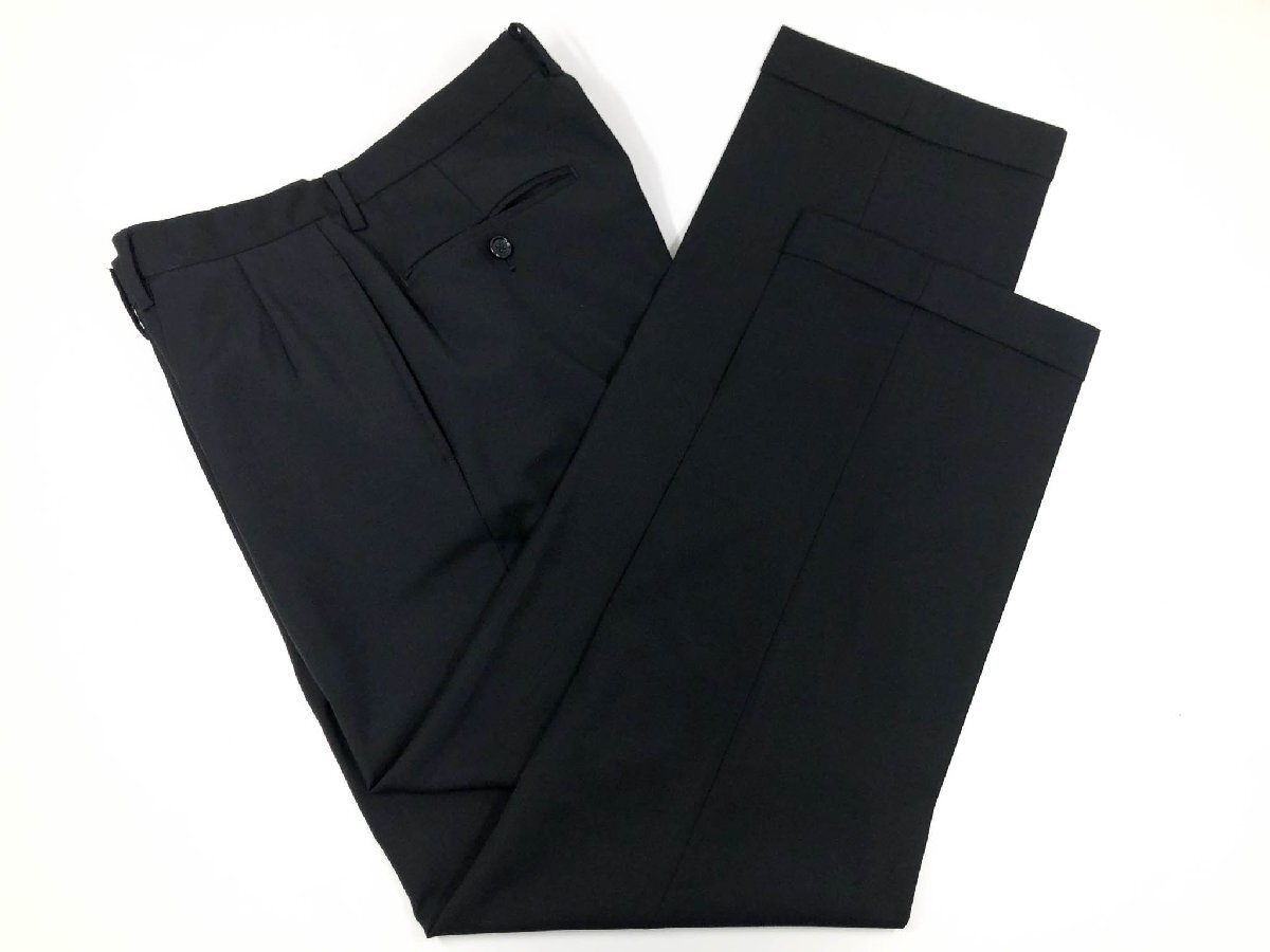・スラックス・・・ウエスト実寸約78センチ(0センチ出し、4センチ詰め可能)、股上約26センチ、渡り幅約31センチ、股下約72~73センチ、総丈約96センチ、裾幅約21センチ、ダブル仕上げ(ダブル幅約3.5センチ、最大でプラス8センチ長くできます)