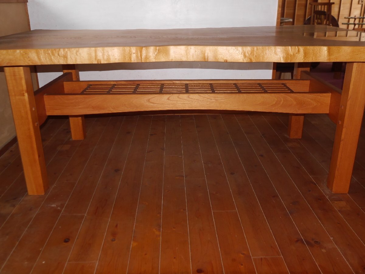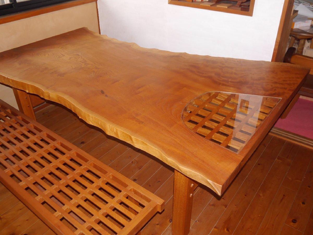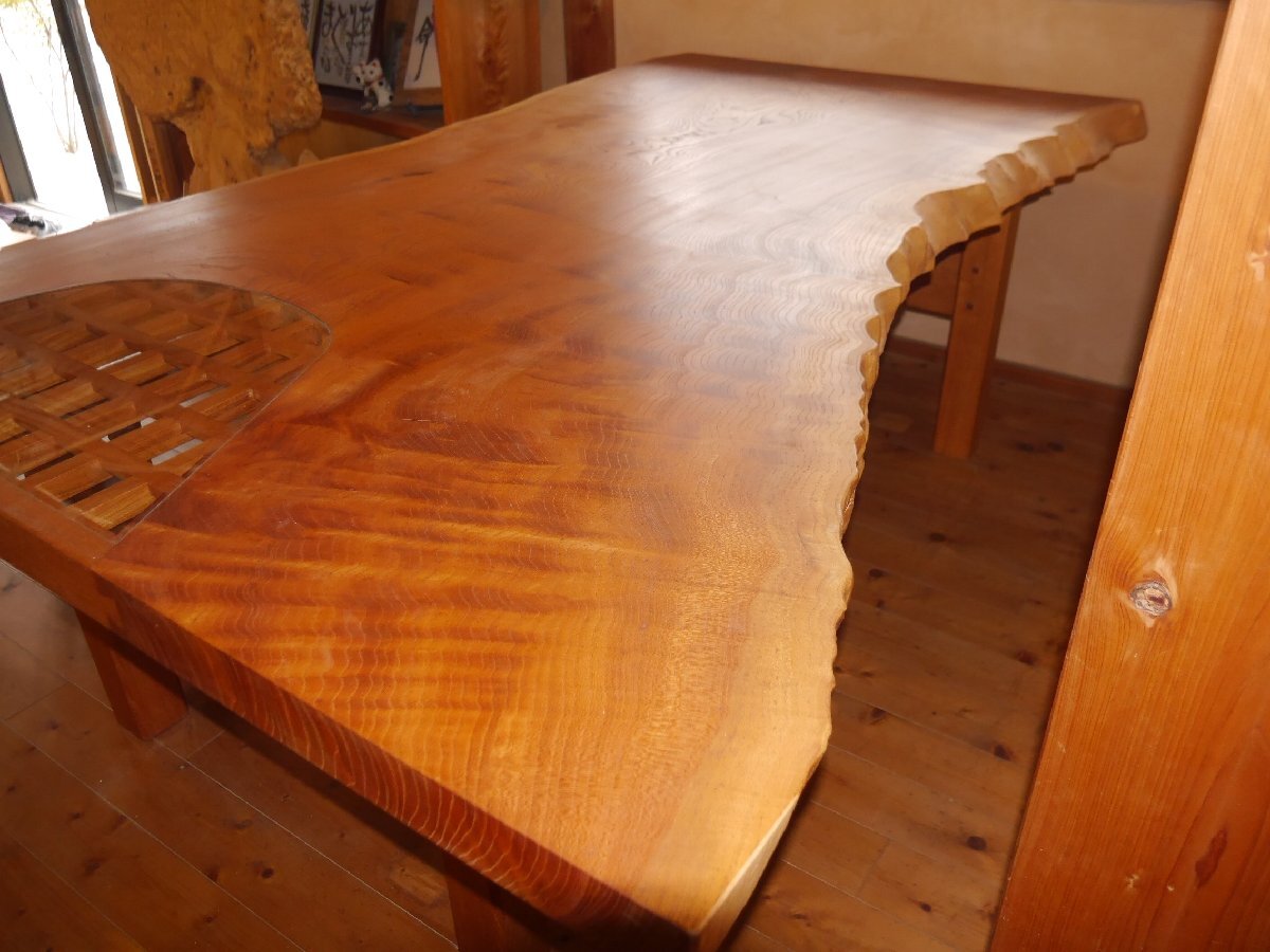 ケヤキ無垢一枚板テーブル、サイズ 長さ 198センチ X 幅 131~87~102センチ X 高さ 70センチ 板厚 60ミリ一部、格子付強化ガラス・天板下に格子棚が付いてい便利です。天然オイル仕上げ、(脚フェルト・お手入れ用オイル・サービス)長さも幅も充分に有り、力強い、色々な杢目が楽しめる木です。硬いケヤキには、珍しい横シマ(チジミ)が入っている木です。一枚板は、長さも幅も有りますので、搬入経路を確認してお買い求め下さい。自然の木なので、実物をご確認下さる事をお薦め致します。なお、作業場に併設した店舗でも販売していますので、品切れの際は何卒ご容赦ください。