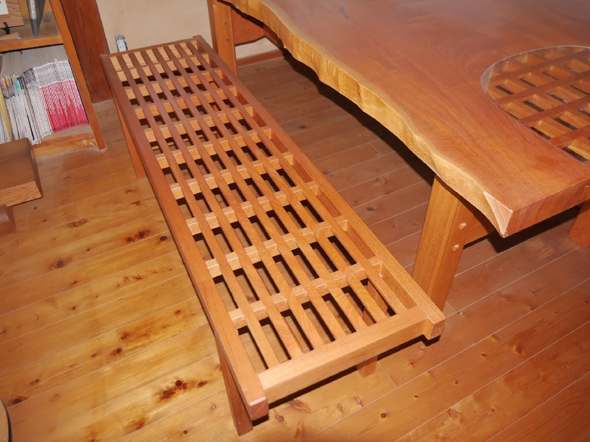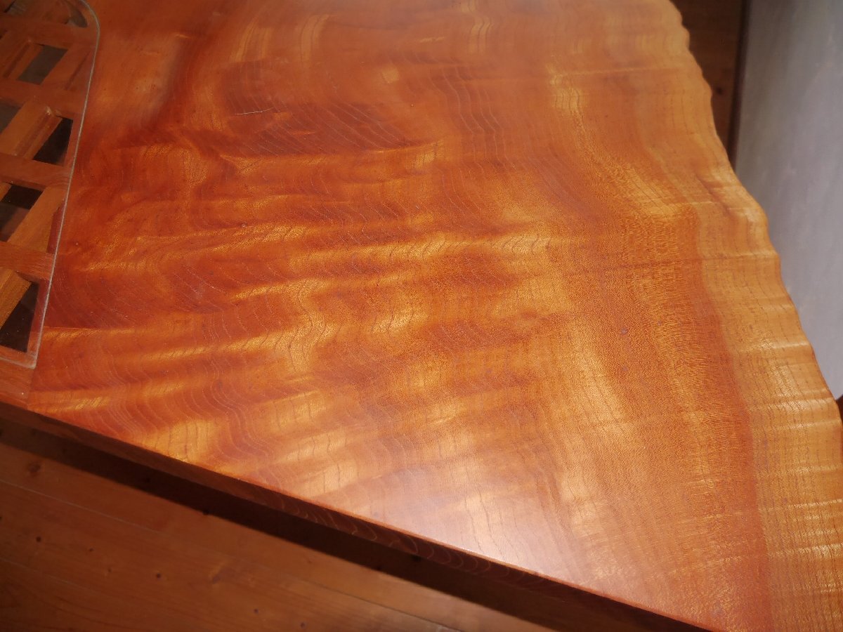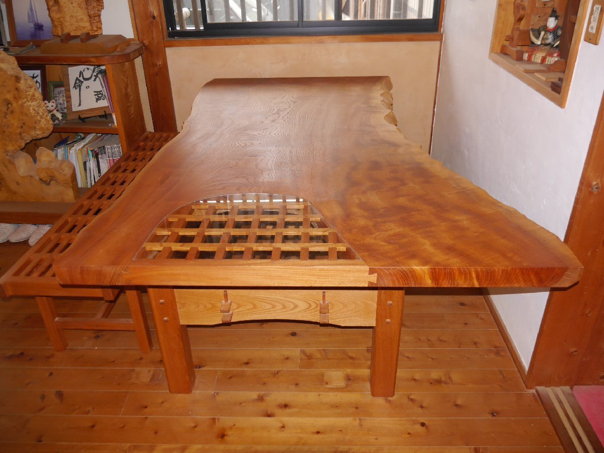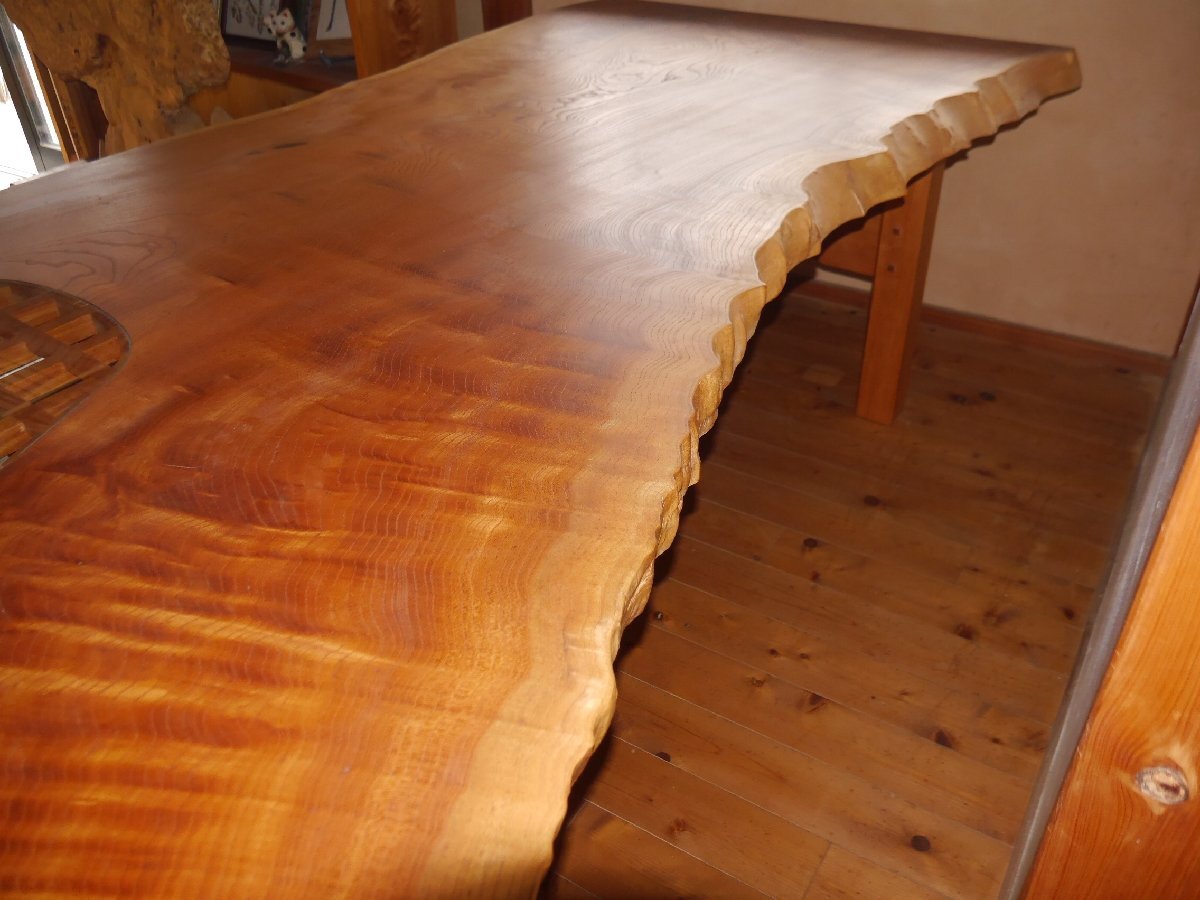 ケヤキ無垢一枚板テーブル、サイズ 長さ 198センチ X 幅 131~87~102センチ X 高さ 70センチ 板厚 60ミリ一部、格子付強化ガラス・天板下に格子棚が付いてい便利です。天然オイル仕上げ、(脚フェルト・お手入れ用オイル・サービス)長さも幅も充分に有り、力強い、色々な杢目が楽しめる木です。硬いケヤキには、珍しい横シマ(チジミ)が入っている木です。一枚板は、長さも幅も有りますので、搬入経路を確認してお買い求め下さい。自然の木なので、実物をご確認下さる事をお薦め致します。なお、作業場に併設した店舗でも販売していますので、品切れの際は何卒ご容赦ください。