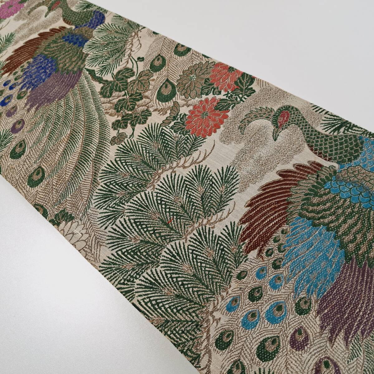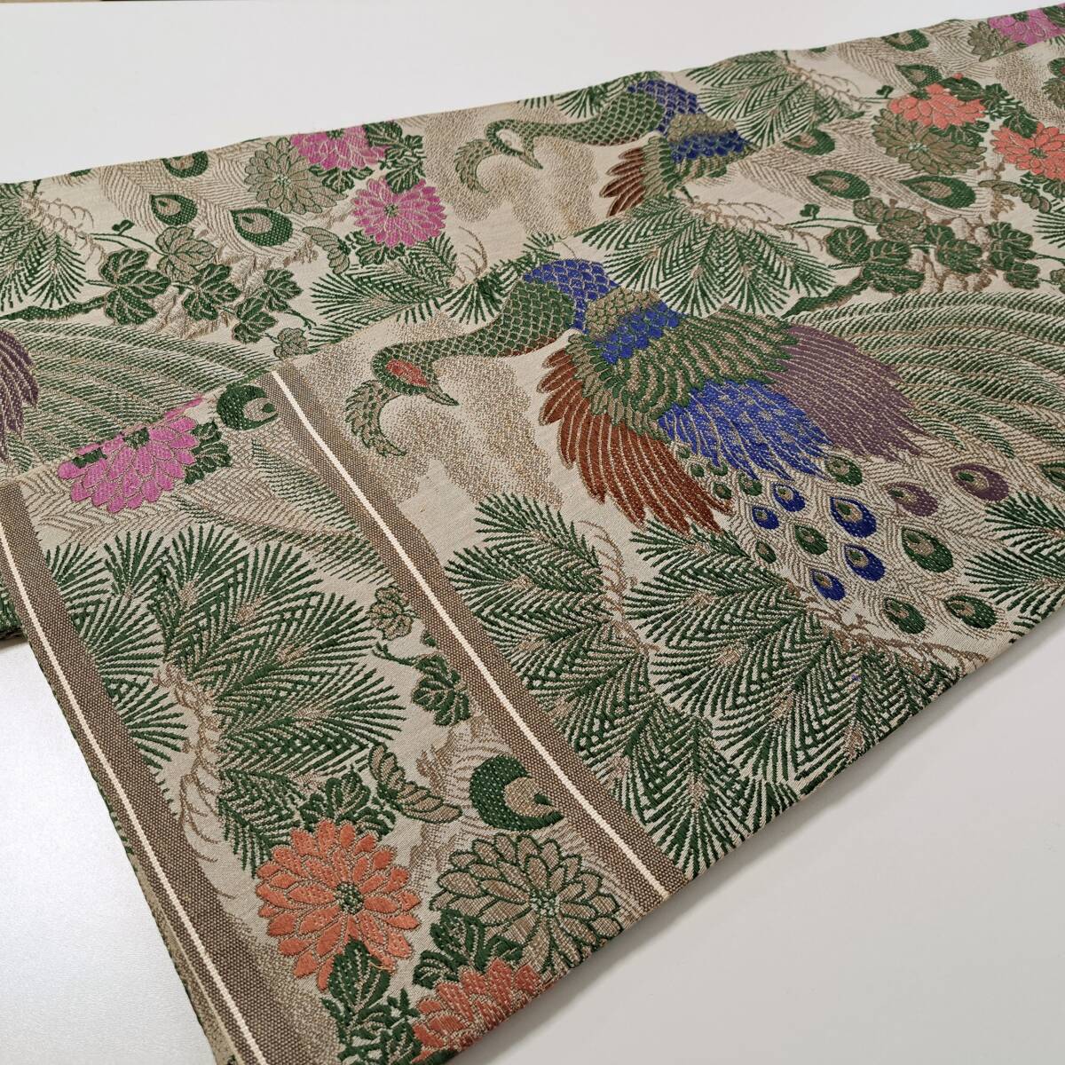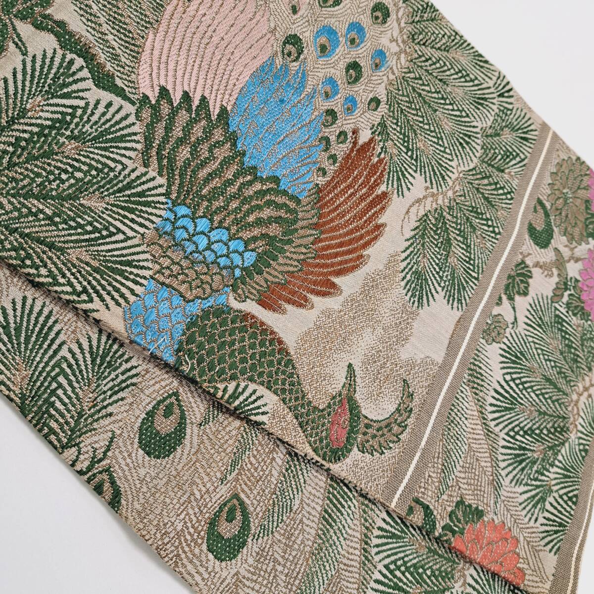 ■着物の越田■幅32長さ372 正絹 丸帯 アンティーク 孔雀 クジャク 菊 引抜き帯 ■む16J03