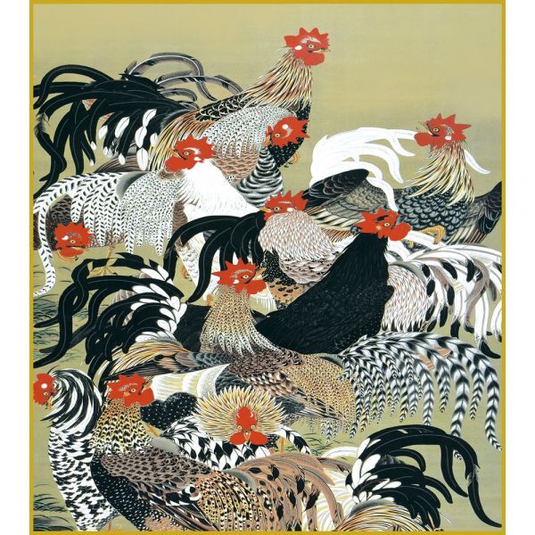 伊藤若冲「群鶏図」 複製色紙額 特殊工芸画 額入り K10-065