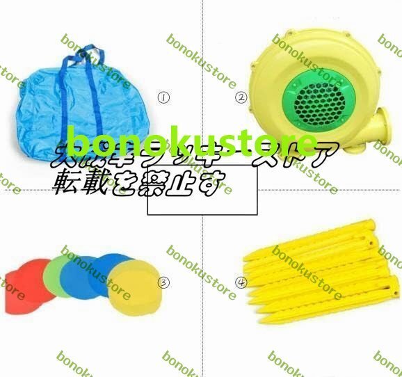 専用ブロワー(450w)、固定用ペグ、本体用ホース、修復用生地、バッグ、取り扱い説明書