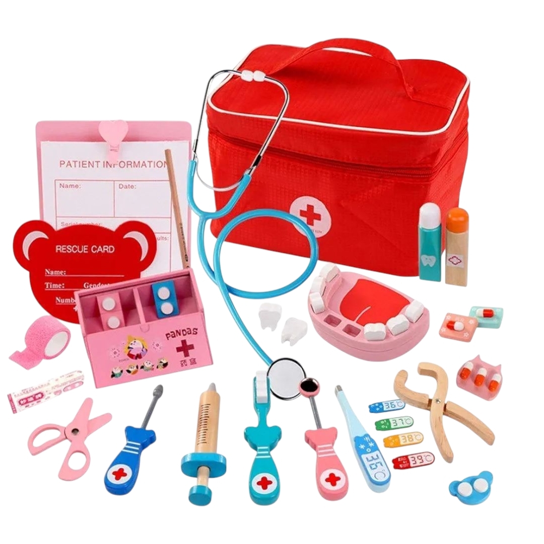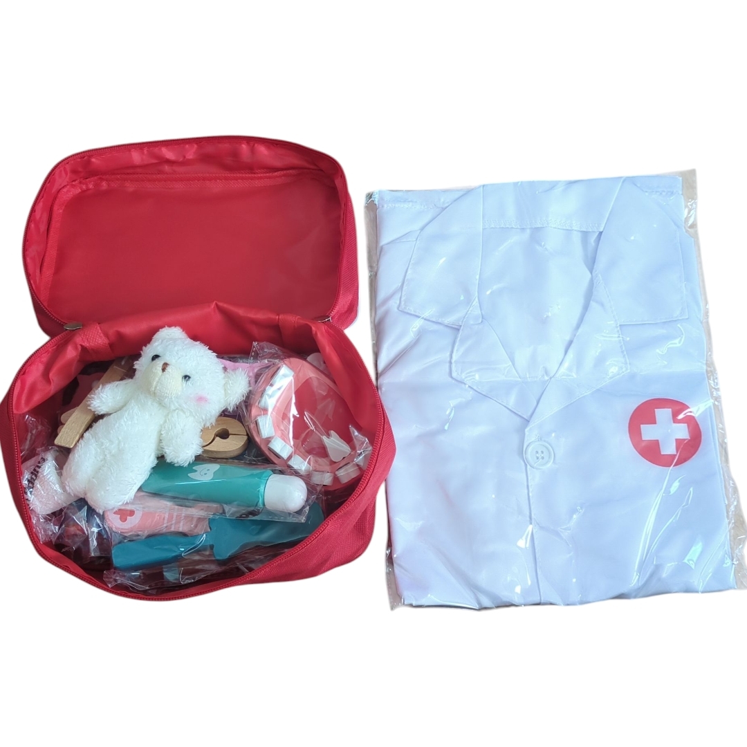 【1円オークション】お医者さんごっこ 電子聴診器 子供の木製シミュレーション布バッグ医学ボックス シミュレーション AAU1220