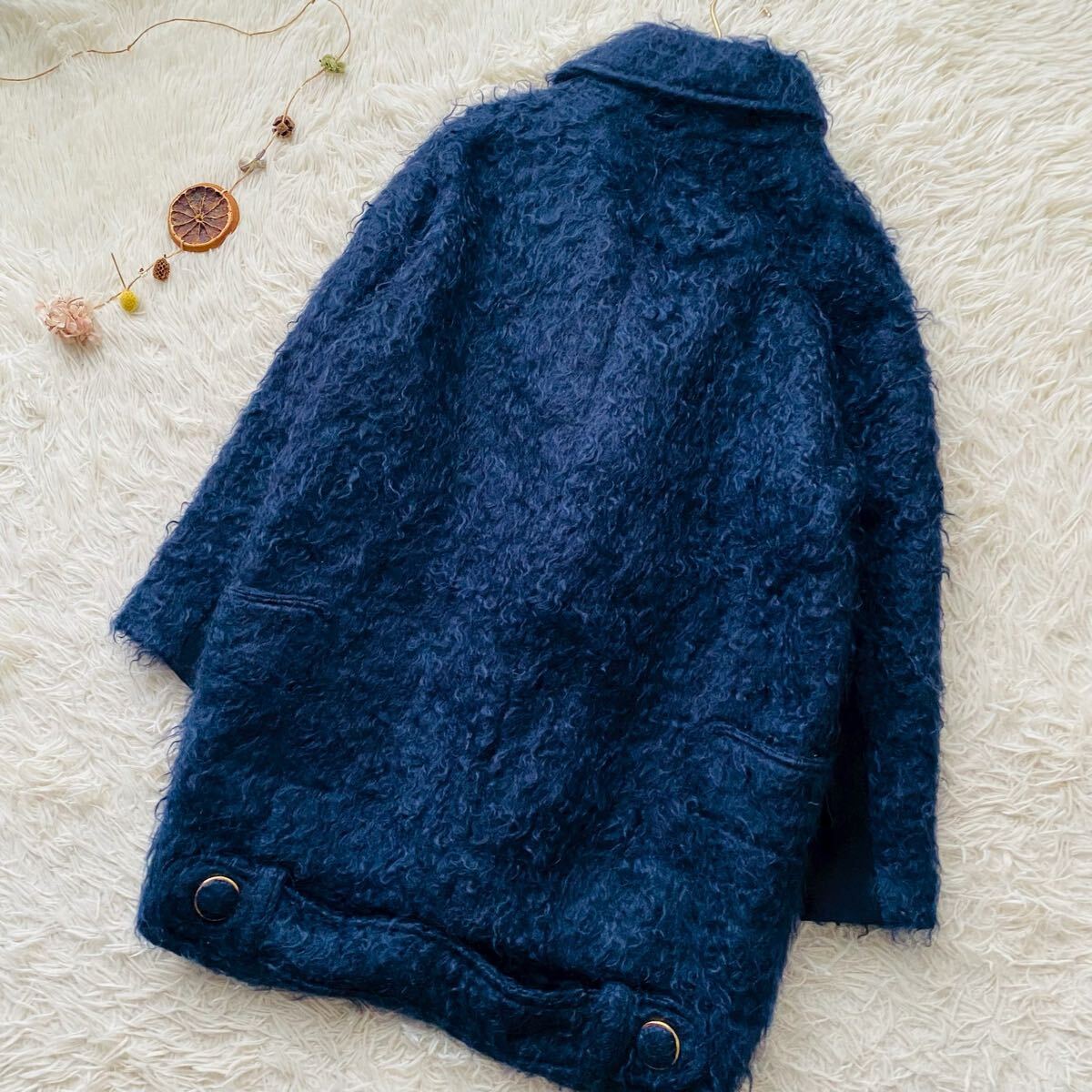 *コーデの幅が広がるダブルブレストのPコート調のシルエット。ドロップショルダーや大きめの襟が顔回りを華やかに、肩を華奢に魅せるデザイン。袖の内側は異素材切替のアンゴラ混素材を施し、ジップ周りは異素材ラムレザー、バックベルトにはゴールドボタン(内共布モヘヤ)など細部にも洗練された仕様が◎オンオフ共に活躍する一着です◎◎
