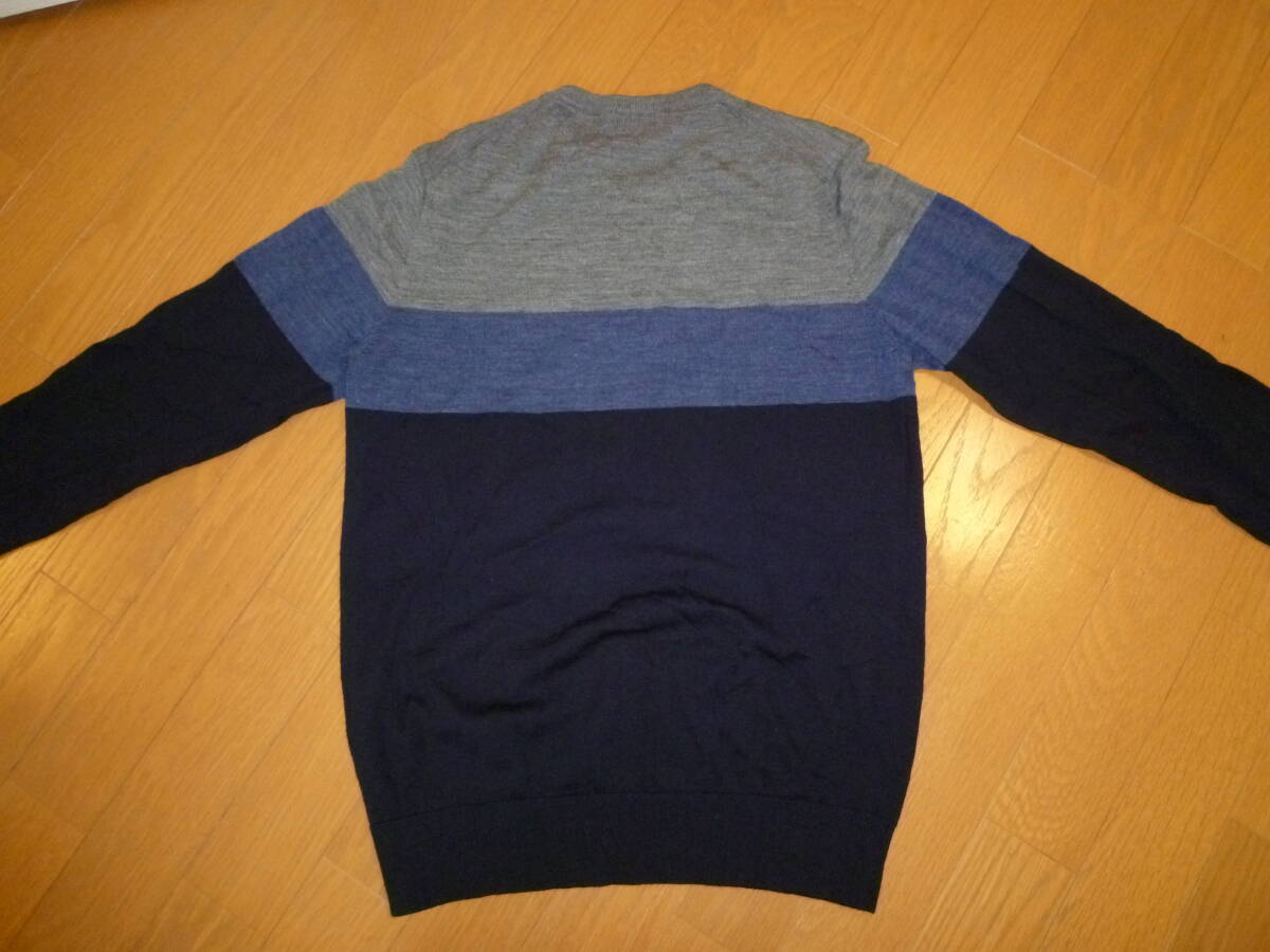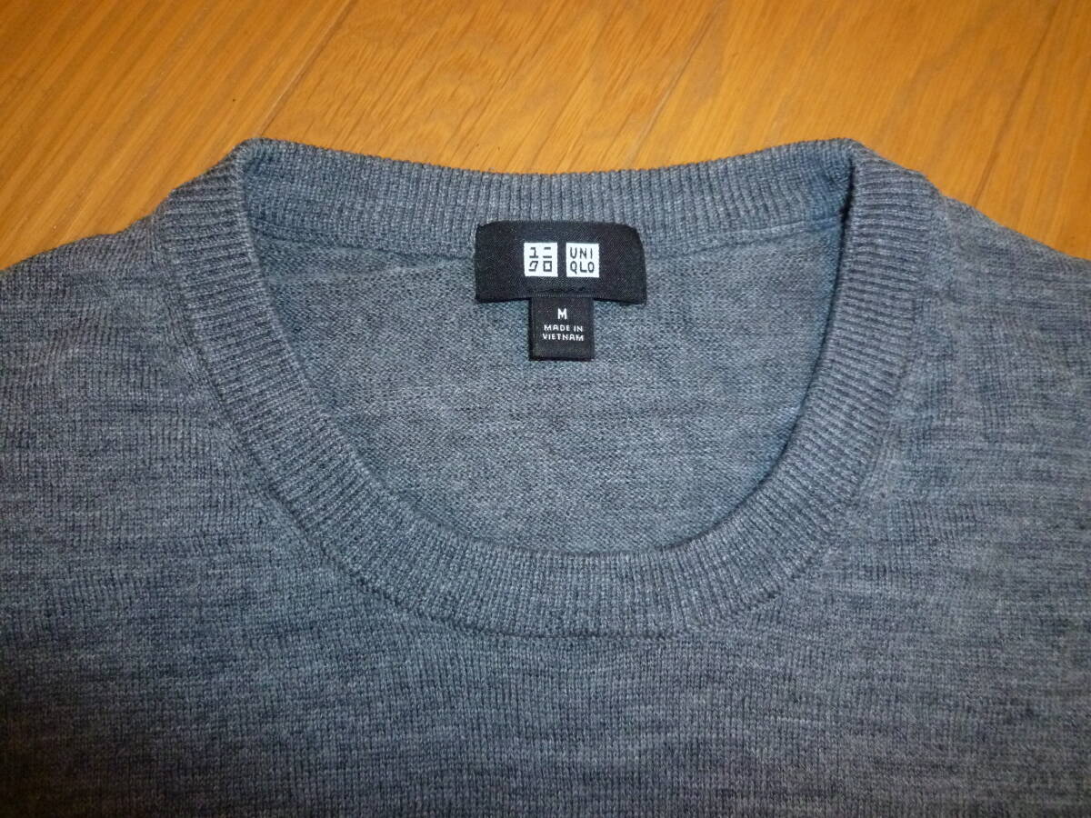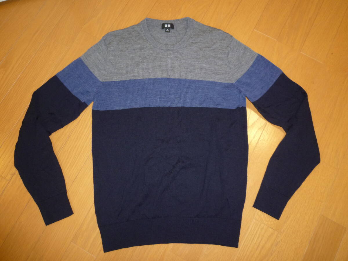 USED ユニクロ ストライプデザイン 長袖クルーネックニットセーター グレーネイビー M ウール 351-409406