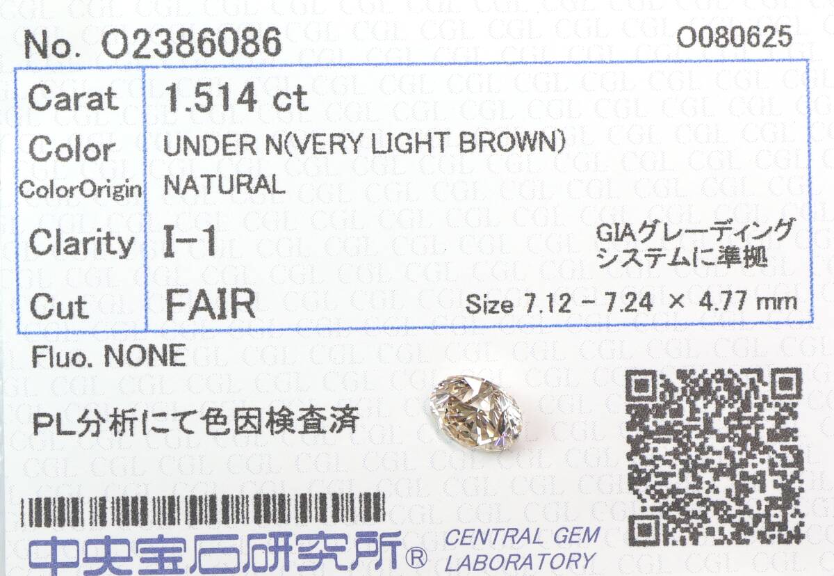 1.514ct!天然ダイヤ VERY LIGHT BROWN(ナチュラルカラー)I1 FAIR