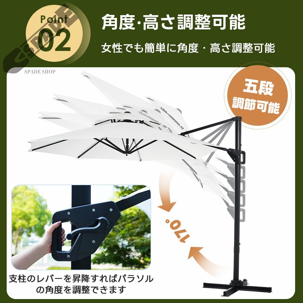 • 【角度高さ調整可能】 女性でも簡単に角度・高さ調整可能 170° 支柱のレバーを昇降すればパラソルの角度を調整できます。360°回転でき、太陽の向きに合わせて、パラソルの角度を簡単に調整できる。直射日光を気にせずくつろぐことができます。ボタンを踏むだけで角度を調整可能。楽々!