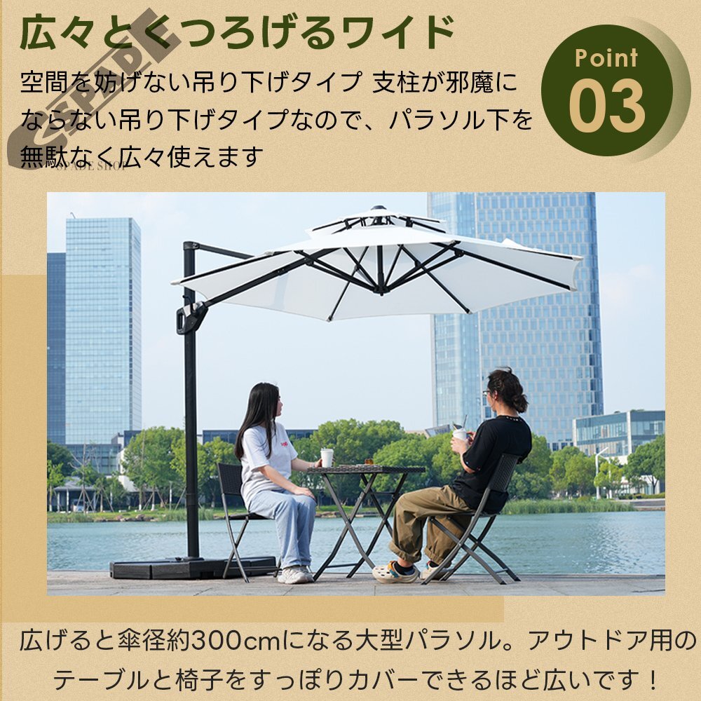 • 【広々とくつろげるワイド】空間を妨げない吊り下げタイプ 支柱が邪魔にならない吊り下げタイプなので、パラソル下を無駄なく広々使えます。広げると傘径約300cmになる大型パラソル。アウトドア用のテーブルと椅子をすっぽりカバーできるほど広いです!大きな傘が心地よい日陰を作ります。