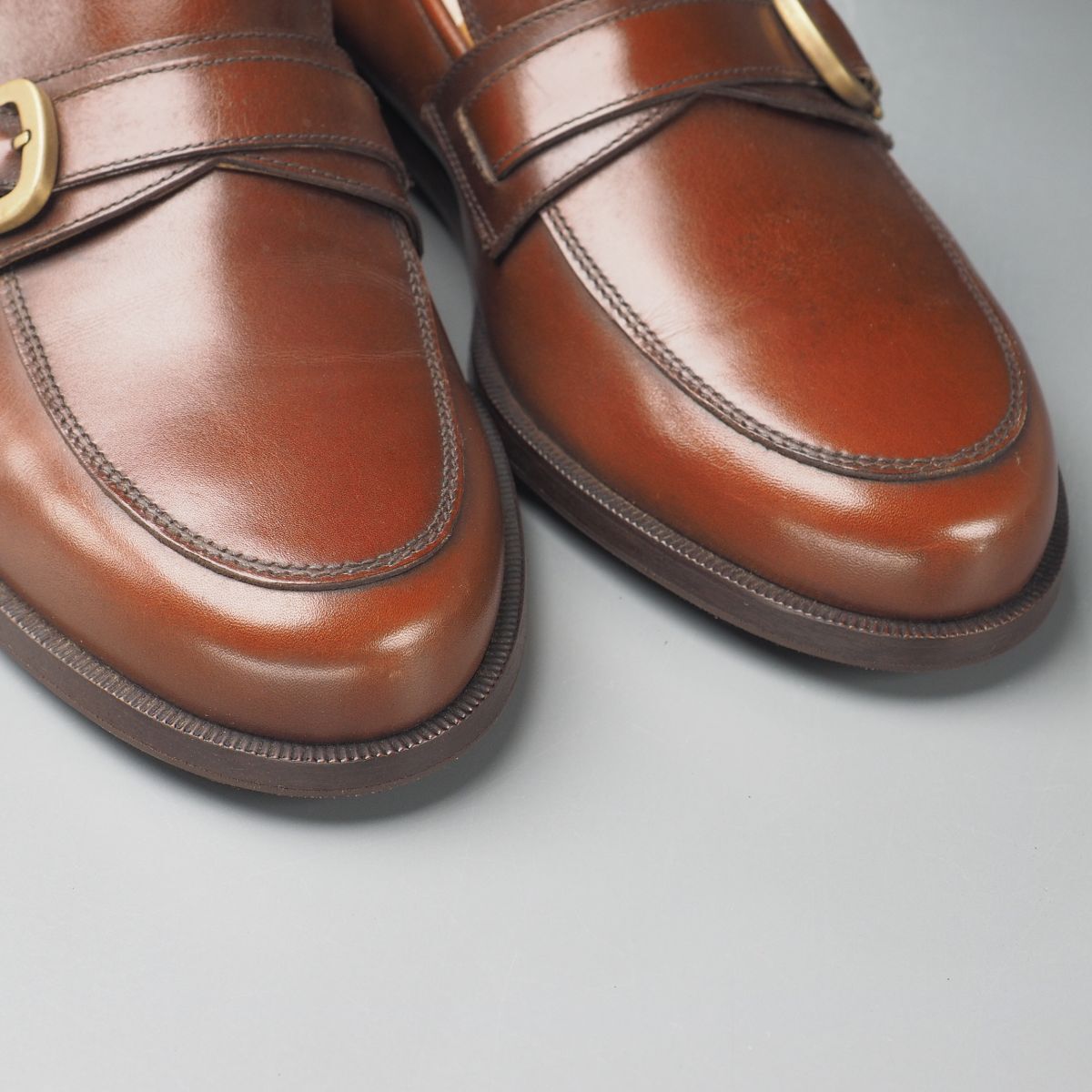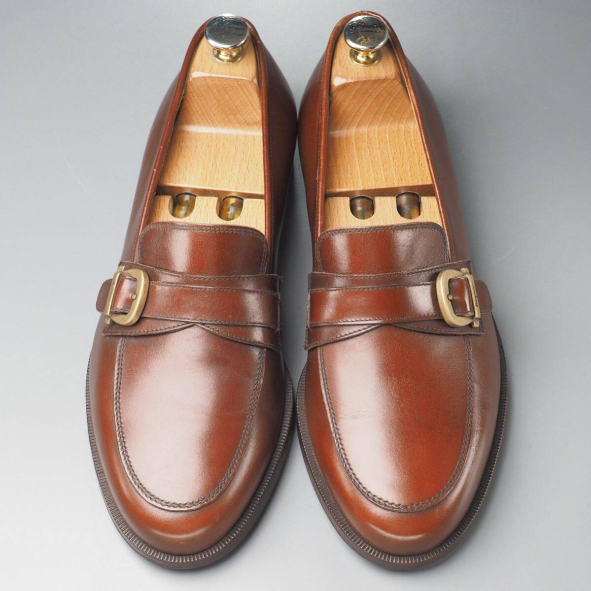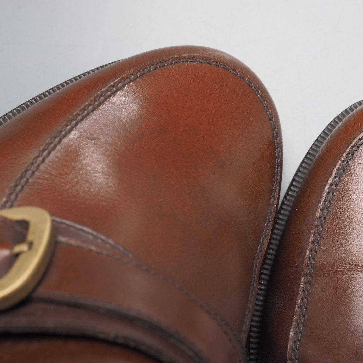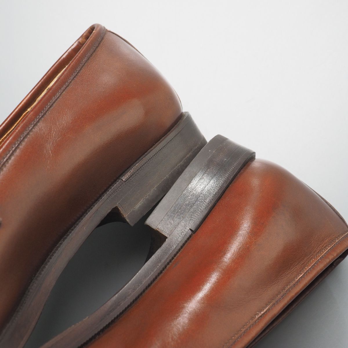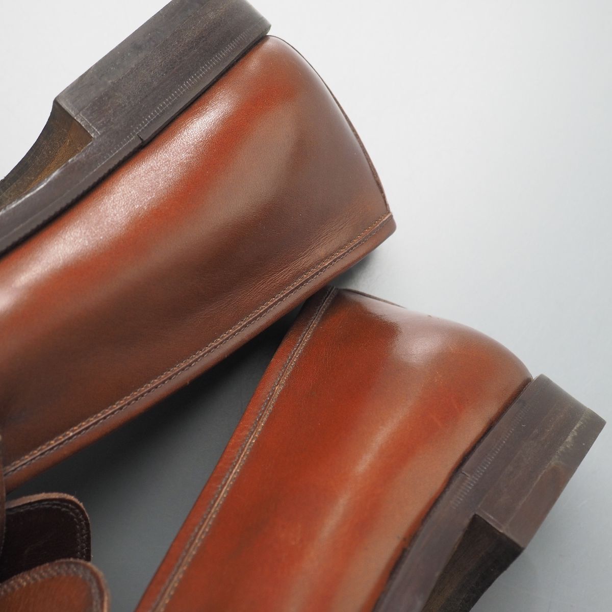 【コンディション詳細】 アッパーのシワ、色ムラや薄い擦れ、小キズ、薄い汚れ、左足のモカに点々と淡いシミ、ヒールライニングに若干汚れが見られますが、その他気になるようなダメージ等なくこれからも気持ちよくご愛用いただけます。 アウトソールは前面にラバーの半張りが施され、ヒールの減りは1mm程度です。 |