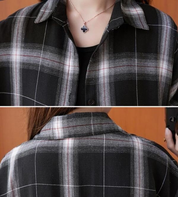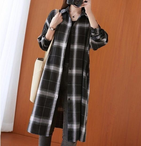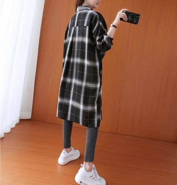 秋新品 ナチュラル ゆったり★チェック柄★襟付き★普段着 大きいサイズ★長袖 シャツチュニックワンピース ★Lサイズ