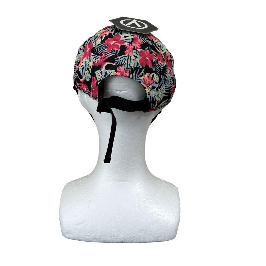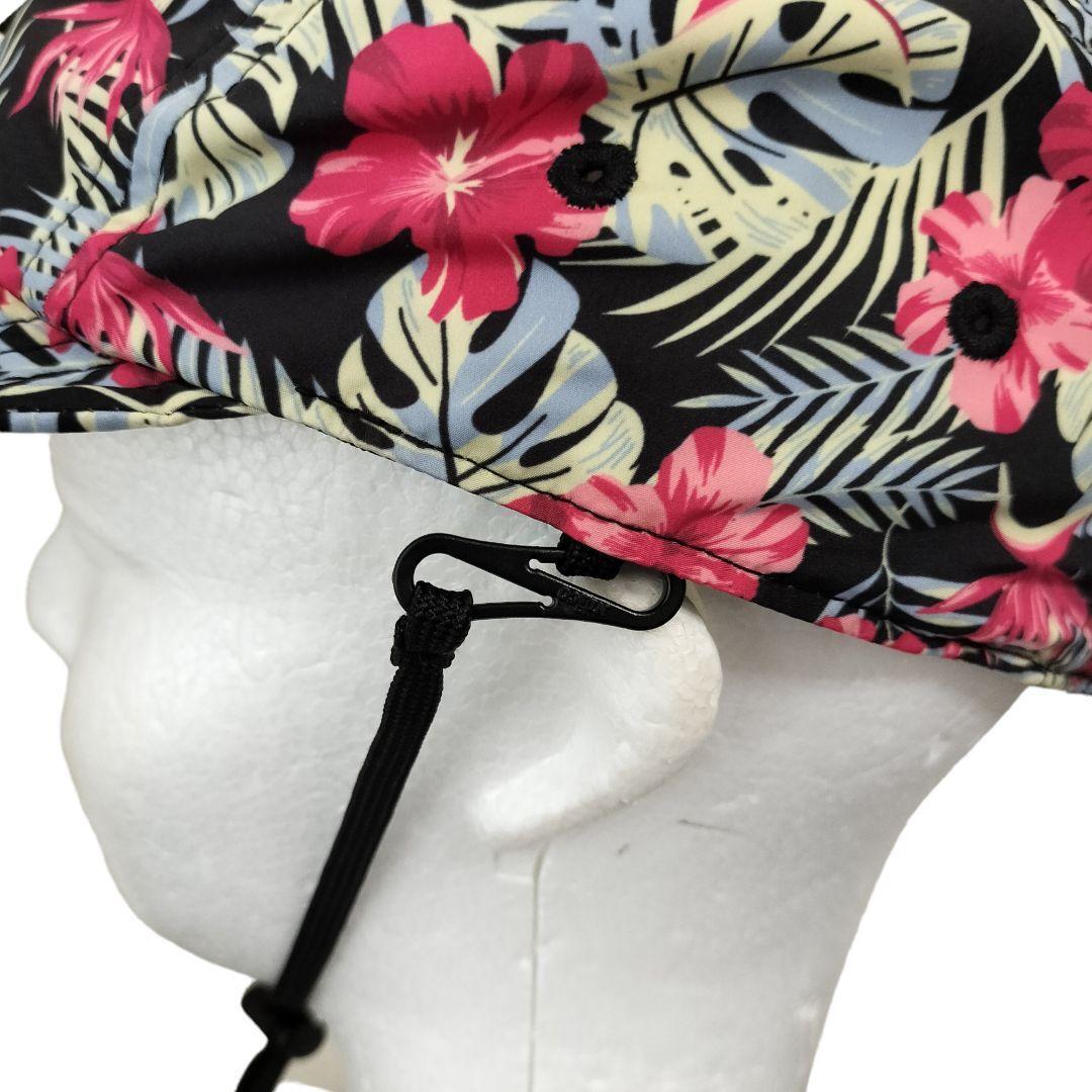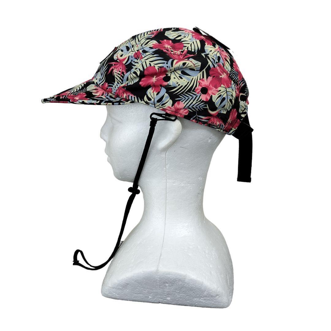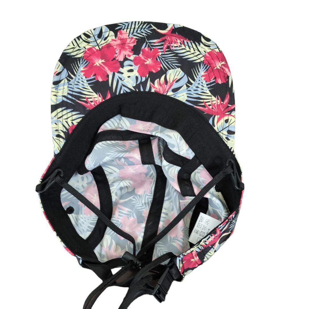 ナイロン素材のようなサラサラしたポリエステル素材です。アゴひもは取り外し可能で、ドローコードが付いています。ツバが長いので日差し避けにもなりますし、ツバが立つので視界を広げたい時に便利です。○○ドレッソのようなかわいい派手な花柄カラーなので、シンプルなウェアリングの時でも良いアクセントになりかわいいです