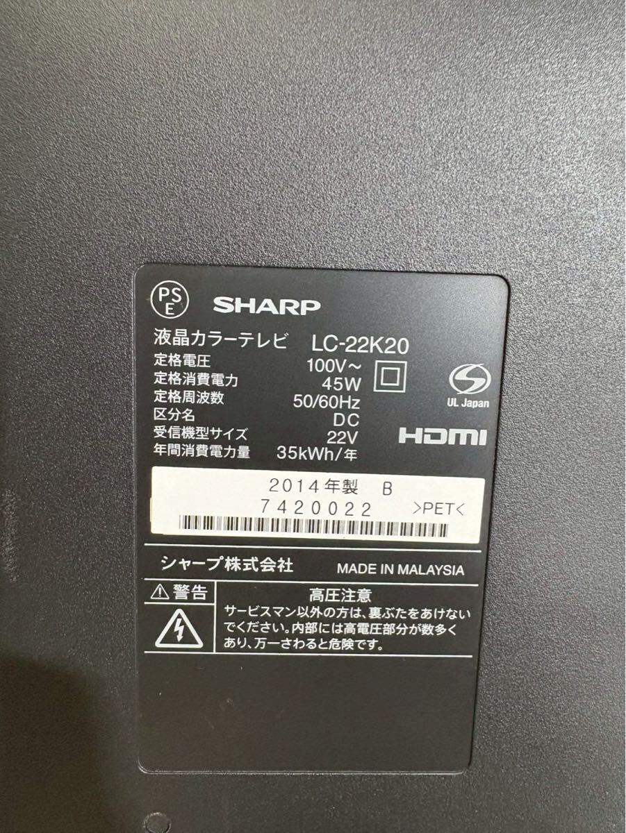 SHARP シャープ LED AQUOS LC-22K20 22V型 地デジ液晶テレビ 2014年製