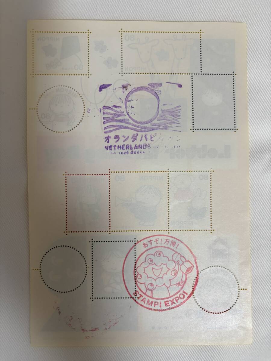 自宅保管しておりました。表と裏に万博会場で、オランダパビリオンとミャクミャクのスタンプを押してきました。