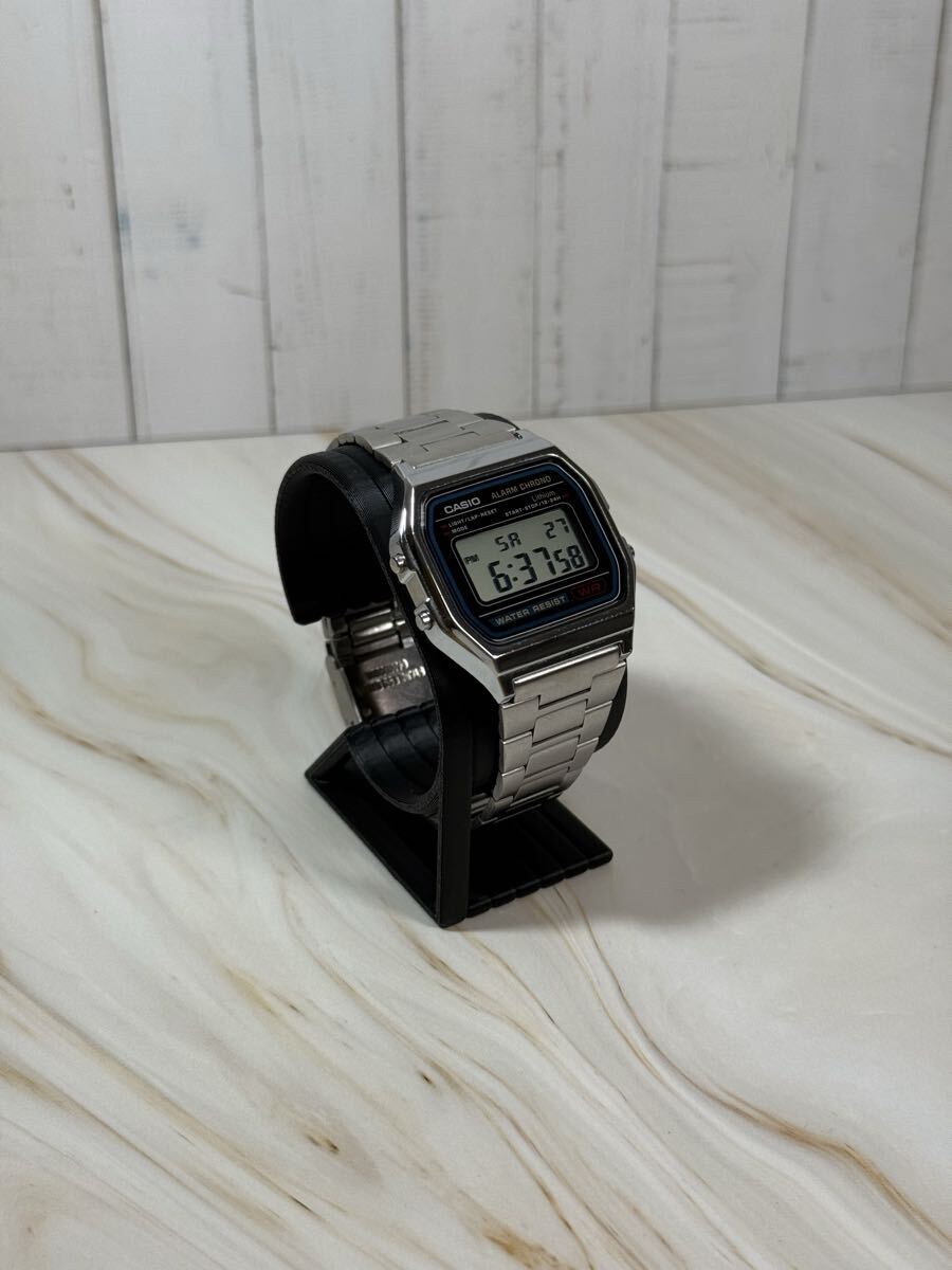 シンプルで実用的なデザインの腕時計スタンドです。耐久性のあるプラスチック素材を使用し、軽量ながらもしっかりと腕時計を支えることができます。デスクや棚の上で時計を綺麗にディスプレイでき、日常的な収納にも最適です。