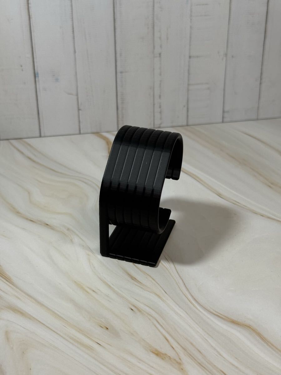 曲線的な形状が特徴で、腕時計を自然な形で保持し、コレクションの展示や普段使いの時計置き場としても便利です。ブラックカラーで落ち着いた雰囲気を持ち、インテリアを選ばずに馴染みます。