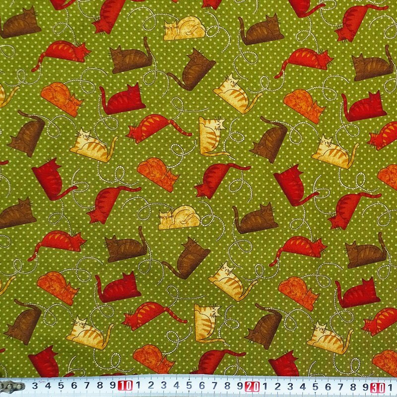 抹茶色に白い水玉の地模様の上に直線と雲形定規だけで描いた様な平面的なネコが散らばっています。