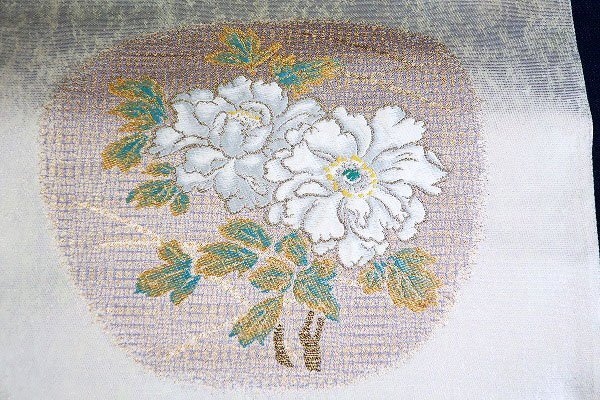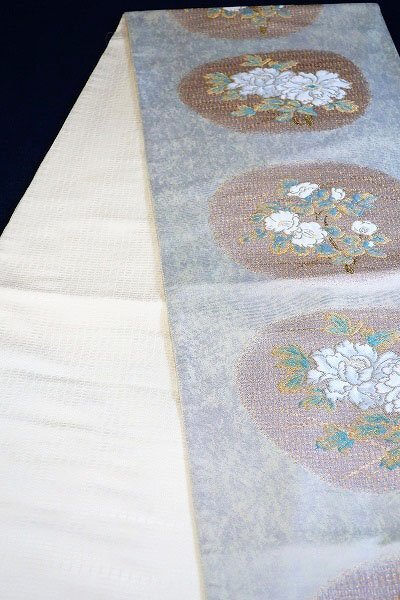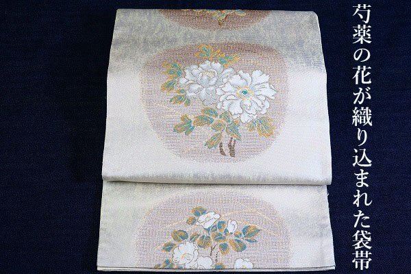 白のまだら地に芍薬、牡丹が織り込まれている袋帯です。 落ち着きのある華やかさを持った一本です。 担当:伊藤 |
