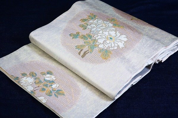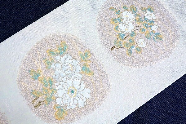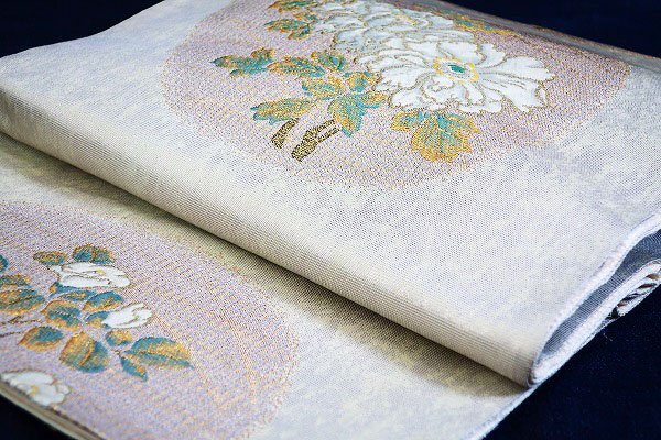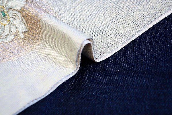 袋帯 白地 芍薬 牡丹 長さ4m37㎝ 豪華 お洒落 フォーマル 正絹 着物フィ m-5242 |