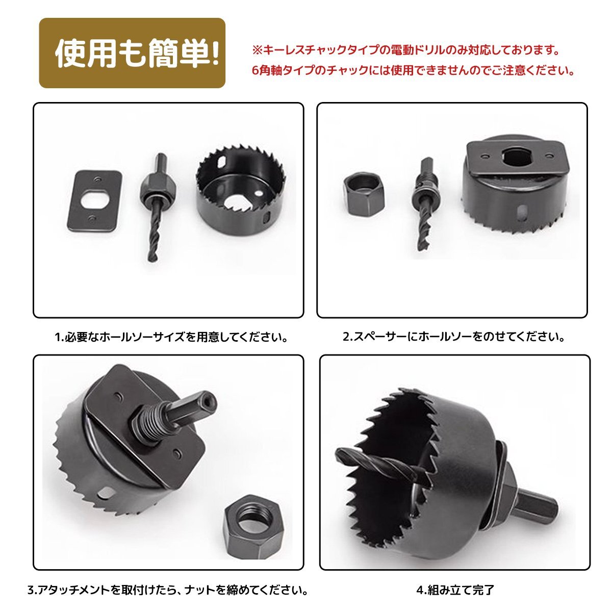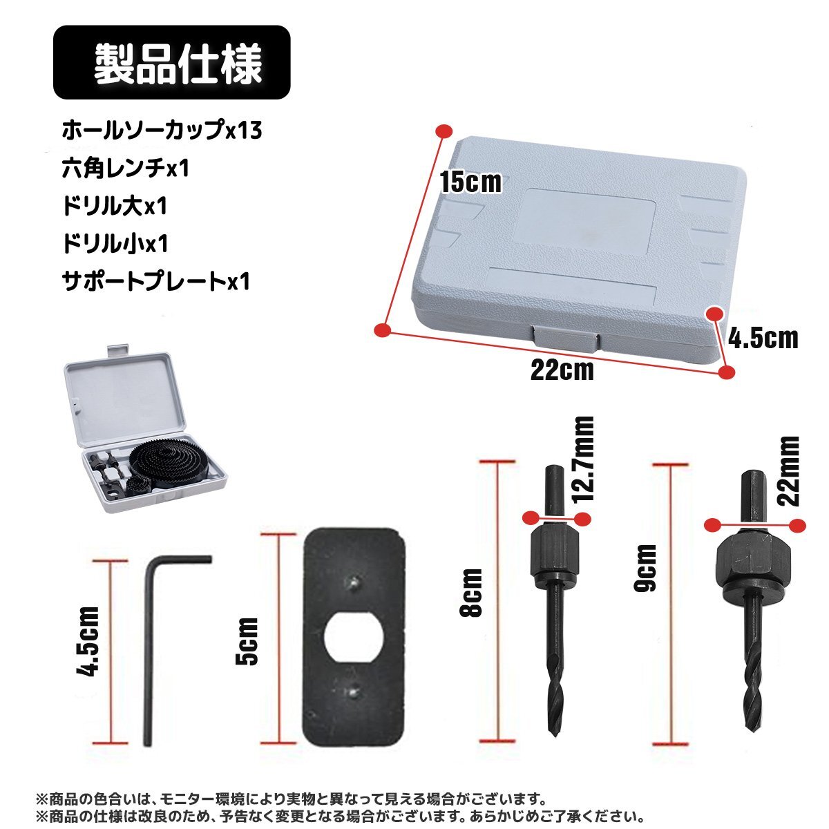 ホールソーカップ×13、六角レンチ×1、ドリル大×1、ドリル小×1、サポートプレート×1の充実セット。用途に応じてサイズを使い分けられます。