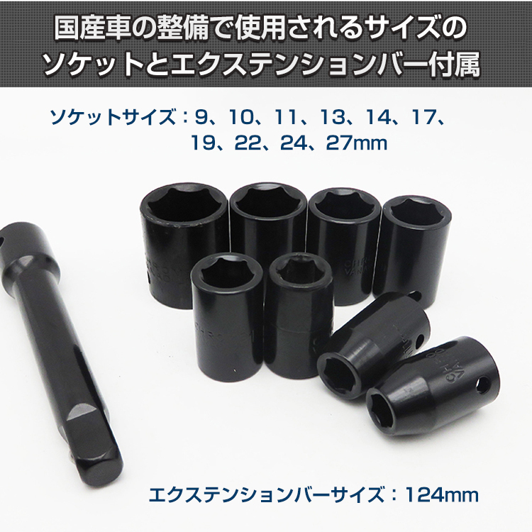 ■国産車の整備で使用されるサイズのソケットとエクステンションバー付属