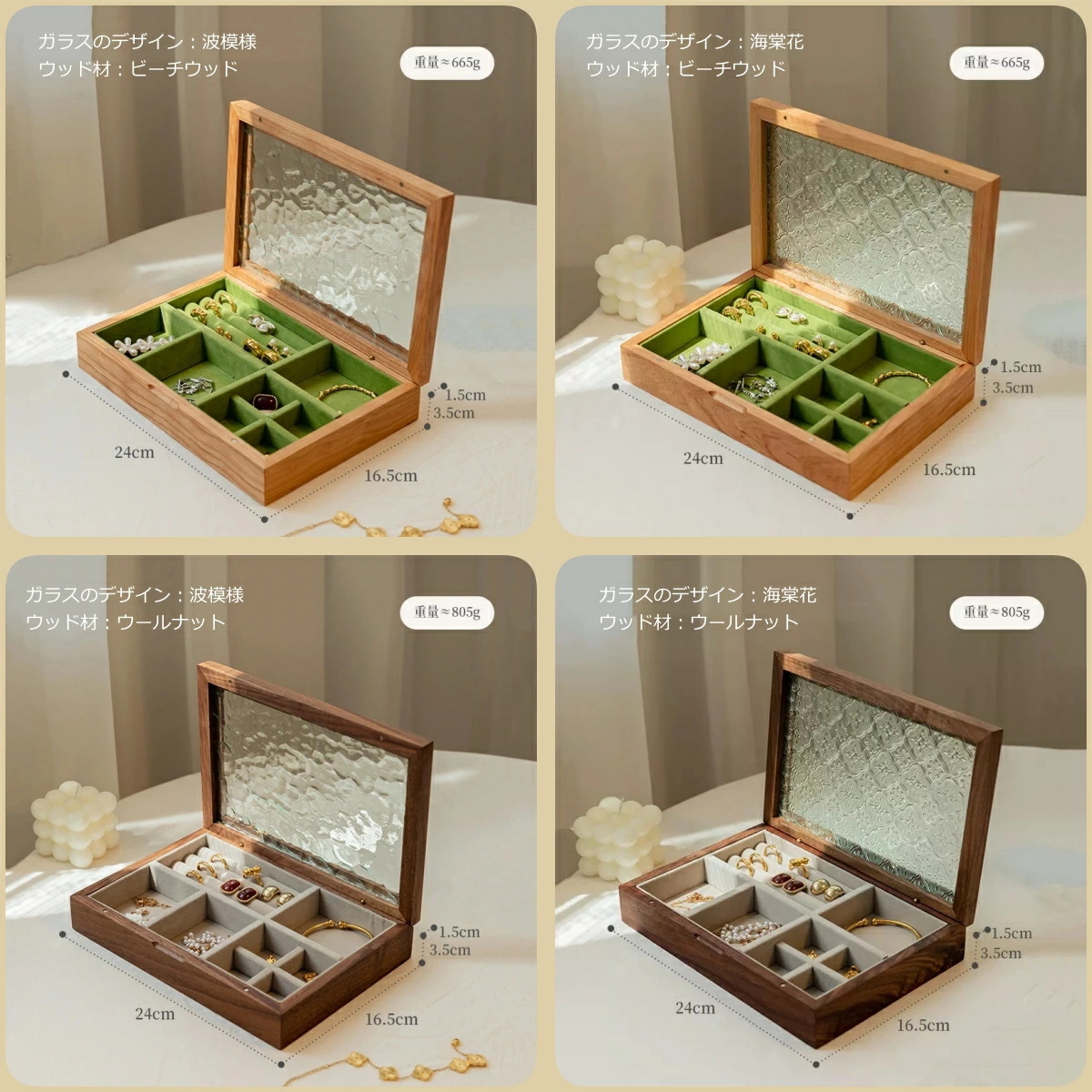 フローラガラス ジュエリーボックス アクセサリーケース 木製 ビーチウッド おしゃれ 高級 宝石箱アクセサリー 収納 ケース
