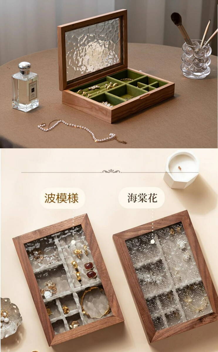 手作りジュエリーボックスは、あなたの大切なアクセサリーを美しく整理し、保管するための理想的な選択です。ビーチウッドとウールナットの木材を使用したこの一品は、耐久性と美観を兼ね備えています。ガラスの蓋は中身を一目で確認できるため、使い勝手が良く、日常の使いやすさを考慮した設計です。