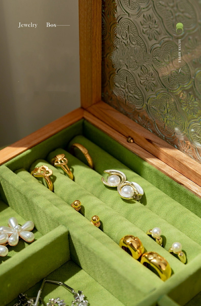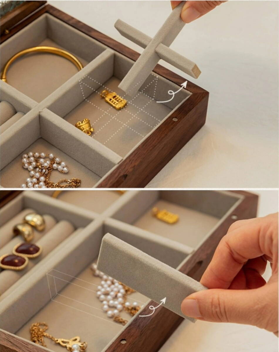 このジュエリーボックスには、調整可能な仕切りがあり、リング、ピアス、ネックレス、メガネ、時計など、様々なアクセサリーを個別に収納できます。それぞれのアイテムがきちんと整理され、取り出しやすい状態を保つことができます。また、シンプルで洗練されたデザインは、どんなインテリアにも自然に溶け込みます。